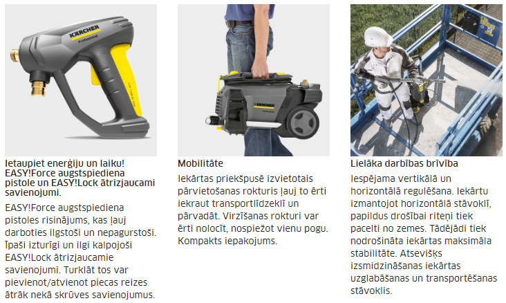 Kompakta, viegla un daudzpusīga aukstā ūdens augstspiediena tīrīšanas iekārta HD 5/15 C Plus, kura pārsteidz ar lielisku mobilitāti, un ko var izmantot kā vertikālā, tā horizontālā stāvoklī. Šai iekārtai ir piederumu novietne, un pateicoties tās misiņa cilindra blokam un automātiskajai spiediena samazināšanas sistēmai, tai nodrošina ilgu kalpošanas laiku. Turklāt iekārta pārsteidz ar dažādiem inovatīviem risinājumiem, kuri uzlabo darbu veikšanas komfortu, kā arī ļauj iekārtu ātrāk sagatavot darbam un tai esot darbībā nomainīt dažādus piederumus. EASY!Force augstspiediena pistole efektīvi absorbē augstspiediena strūklas atsitiena spēku, un nodrošina ērtu tās mēlītes lietošanu, savukārt EASY!Lock ātrizjaucamie savienojumi ļauj pievienot un atvienot piederumus piecas reizes ātrāk par parastajiem skrūvju savienojumiem, turklāt tie ir tikpat izturīgi un ilgkalpojoši. Šāda visaptveroša aprīkojuma pakete ļauj panākt nevainojamu tīrīšanas rezultātu, nenogurdinot iekārtas operatoru.