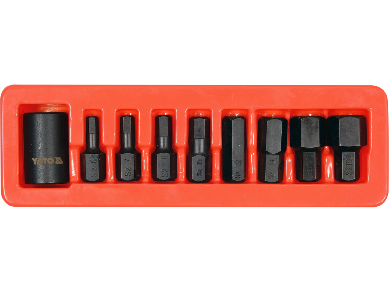 The YATO YT-10662 Impact Hex Bit and Holder Set includes 9 pieces of 1/2" drive tools designed specifically for use in the mechanical industry and automotive service.