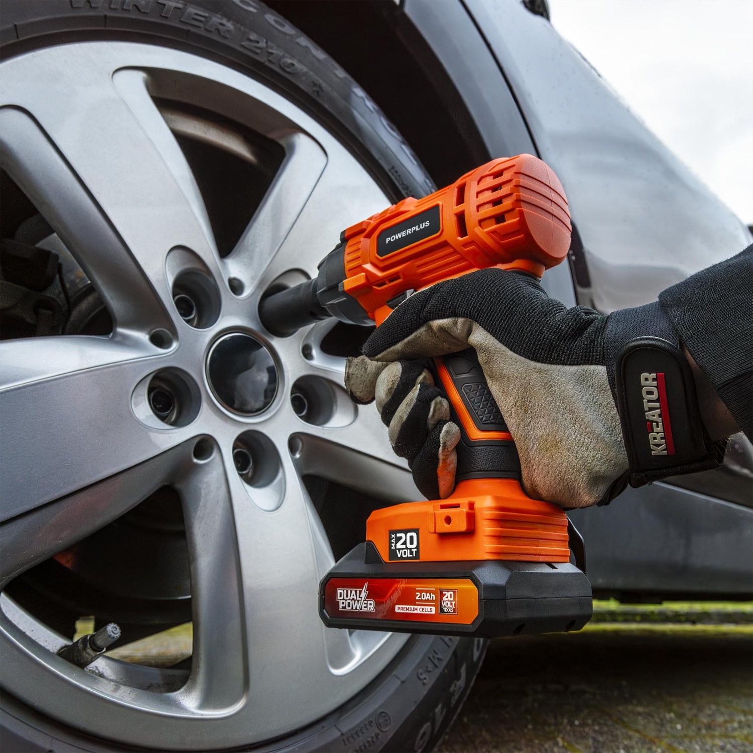 This cordless 20 V impact wrench is perfect for efficiently fastening or loosening nuts or bolts. Replace your car tyres like a pro with this compact Dual Power impact wrench.