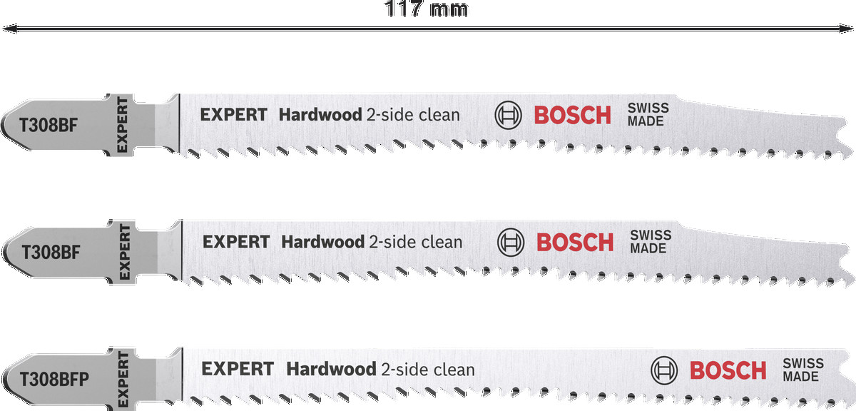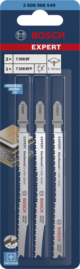 3 figūrzāģa asmeņi 2x T308BF, 1x T308BFP, Figūrzāģiem EXPERT HARDWOOD 2-SIDE CLEAN FIGŪRZĀĢA ASMEŅU KOMPLEKTS, 2608900549, BOSCH