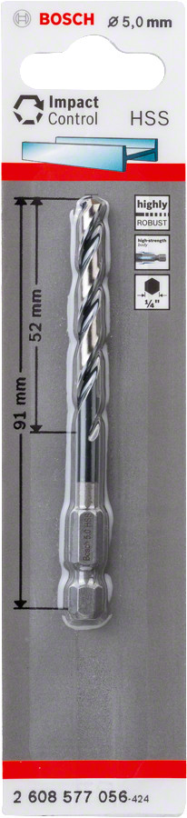 Urbis met., Ø 5mm, 91mm 1/4" 6-kanta kāts, 1gab., Urbjmašīnām/skrūvgriežiem, triecienurbjmašīnām/triecienskrūvgriežiem HSS SPIRĀLVEIDA URBIS IMPACT CONTROL, 2608577056, BOSCH