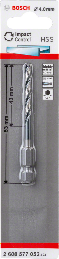 Urbis met., Ø 4mm, 83mm 1/4" 6-kanta kāts, 1gab., Urbjmašīnām/skrūvgriežiem, triecienurbjmašīnām/triecienskrūvgriežiem HSS SPIRĀLVEIDA URBIS IMPACT CONTROL, 2608577052 BOSCH