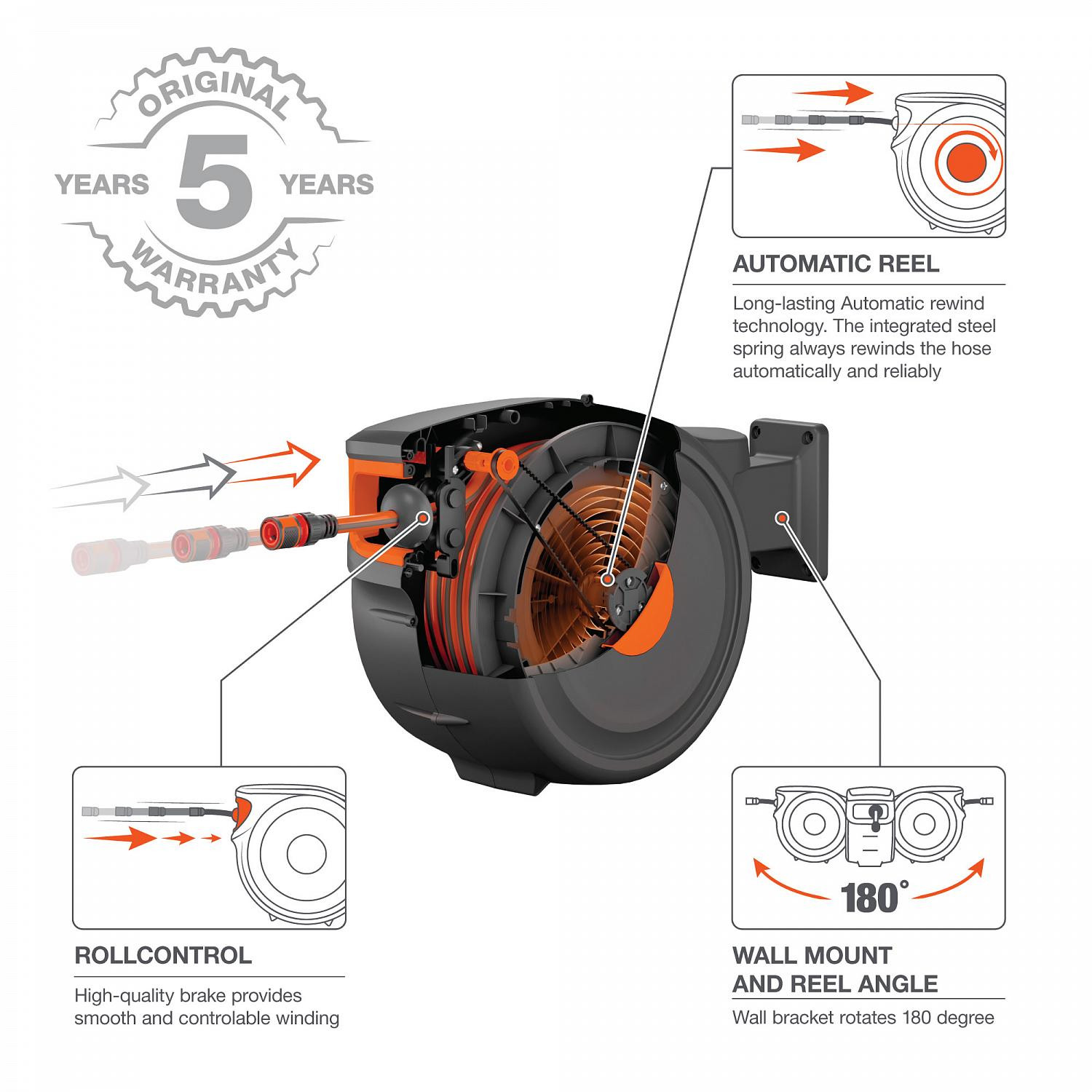 25 m hose installed allow the reel to be used in the gardens from 150 to 300 m2.