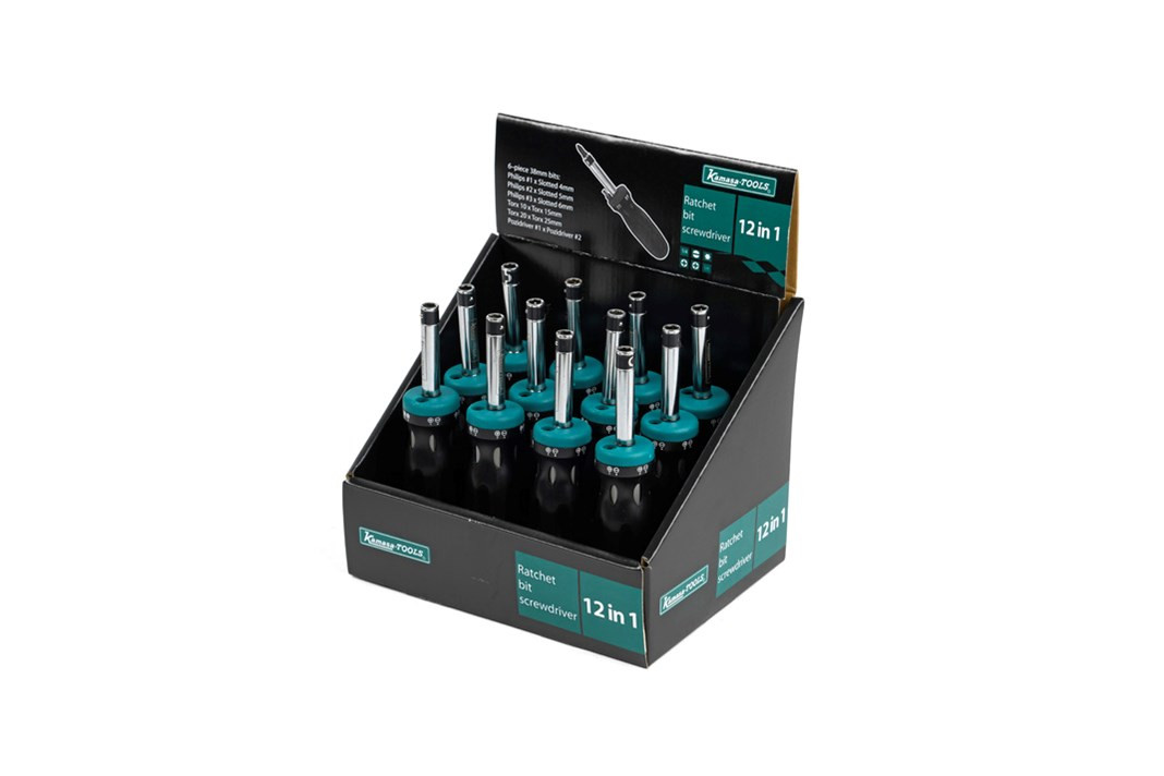 Rokturis ar 12 bitiem, K63069, KAMASA TOOLS, 6 divgalvu bitu, 180 mm garš, ar apgriežamu ratčetu