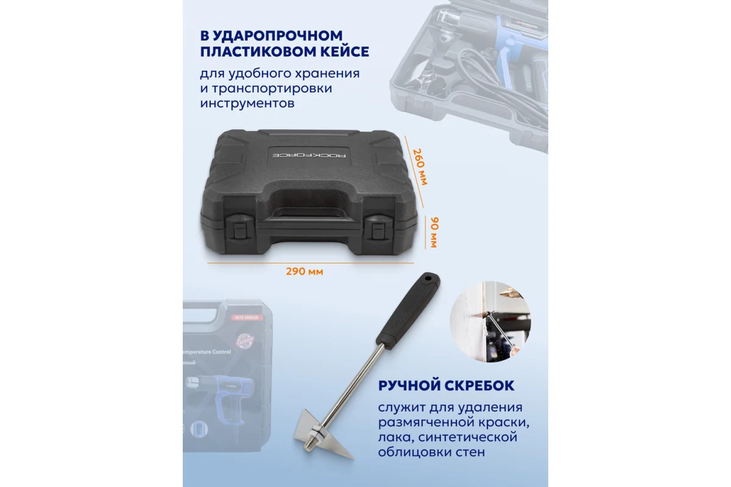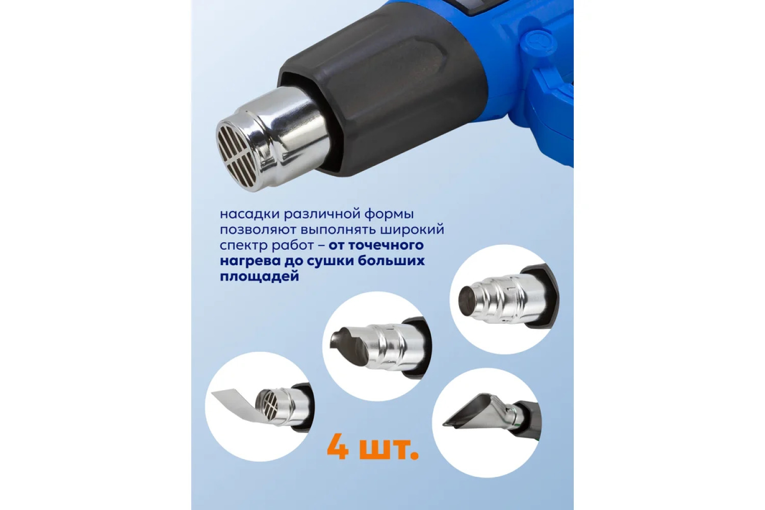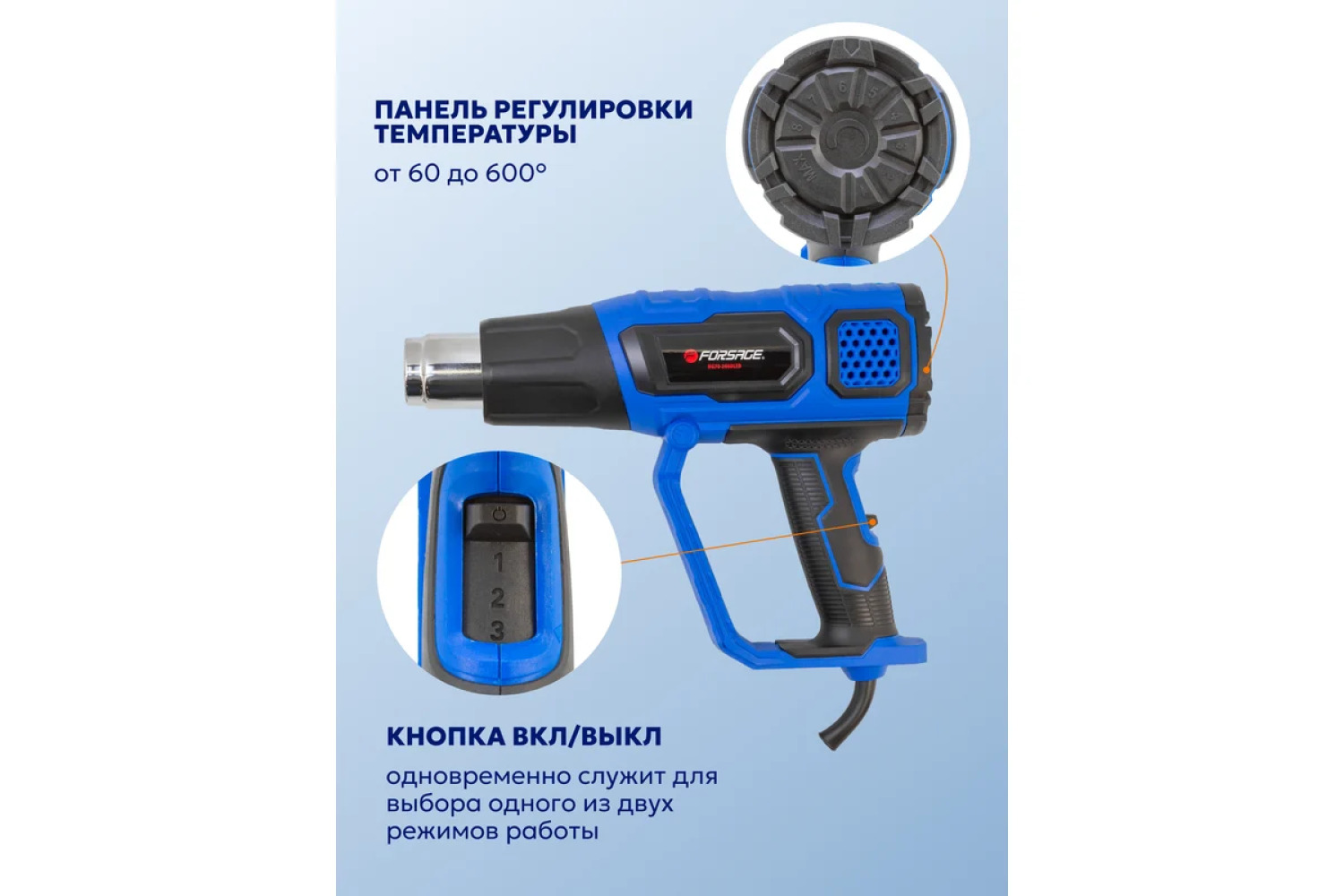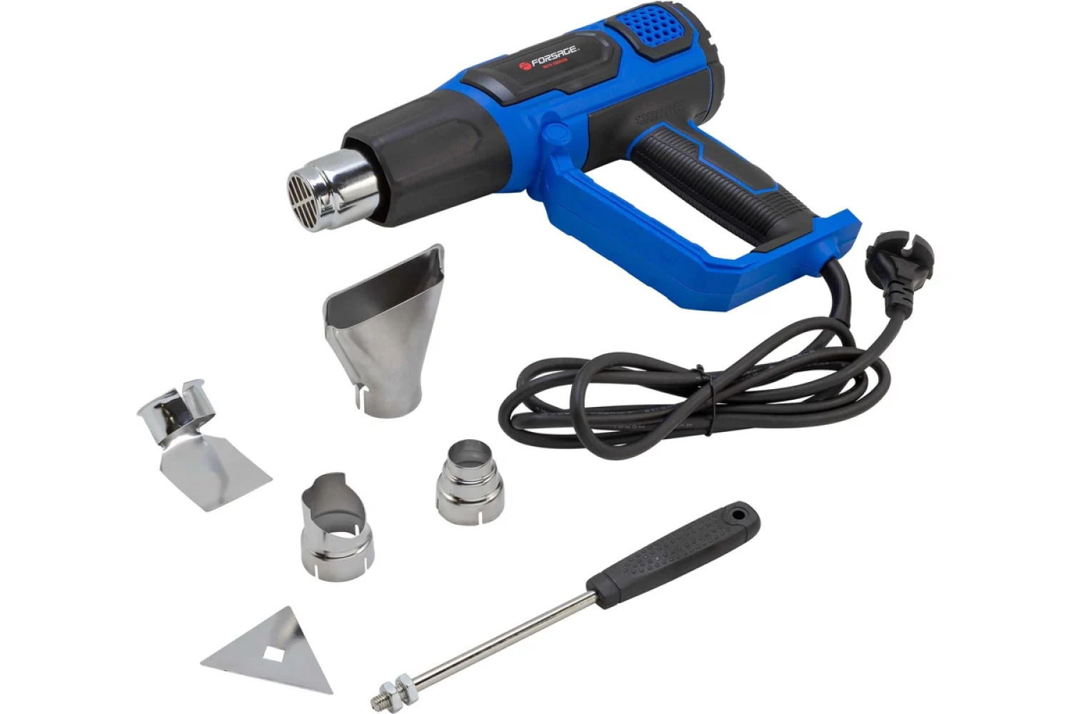 The FORSAGE F-HG70-2000LED is an industrial electric heat gun designed to generate hot air. It is ideal for removing paint and varnish, drying glue joints, and applying heat to various materials such as plaster and gypsum. With three operating modes that offer different temperatures and airflow rates, this heat gun can work effectively with a variety of materials. The increased diameters of the heating wires prevent overheating. The included four nozzles allow for versatile applications, from targeted heating to drying large areas. Additionally, the thermal protection feature safeguards the device and the heating element from damage due to overheating.