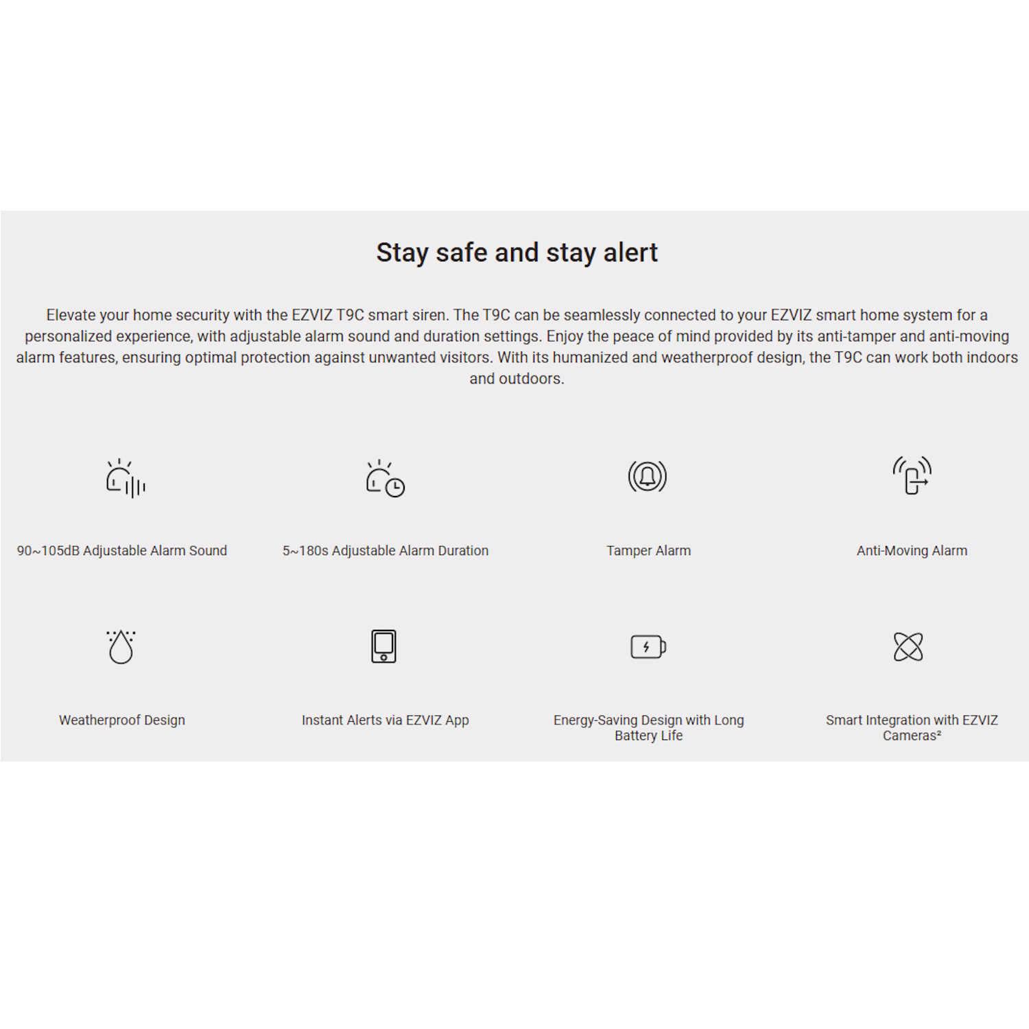 The EZVIZ T9C Smart Siren Alarm is a powerful and intelligent security upgrade, offering customizable alerts, Apple HomeKit compatibility, and real-time mobile notifications. Ensure your home is always protected with EZVIZ smart security!