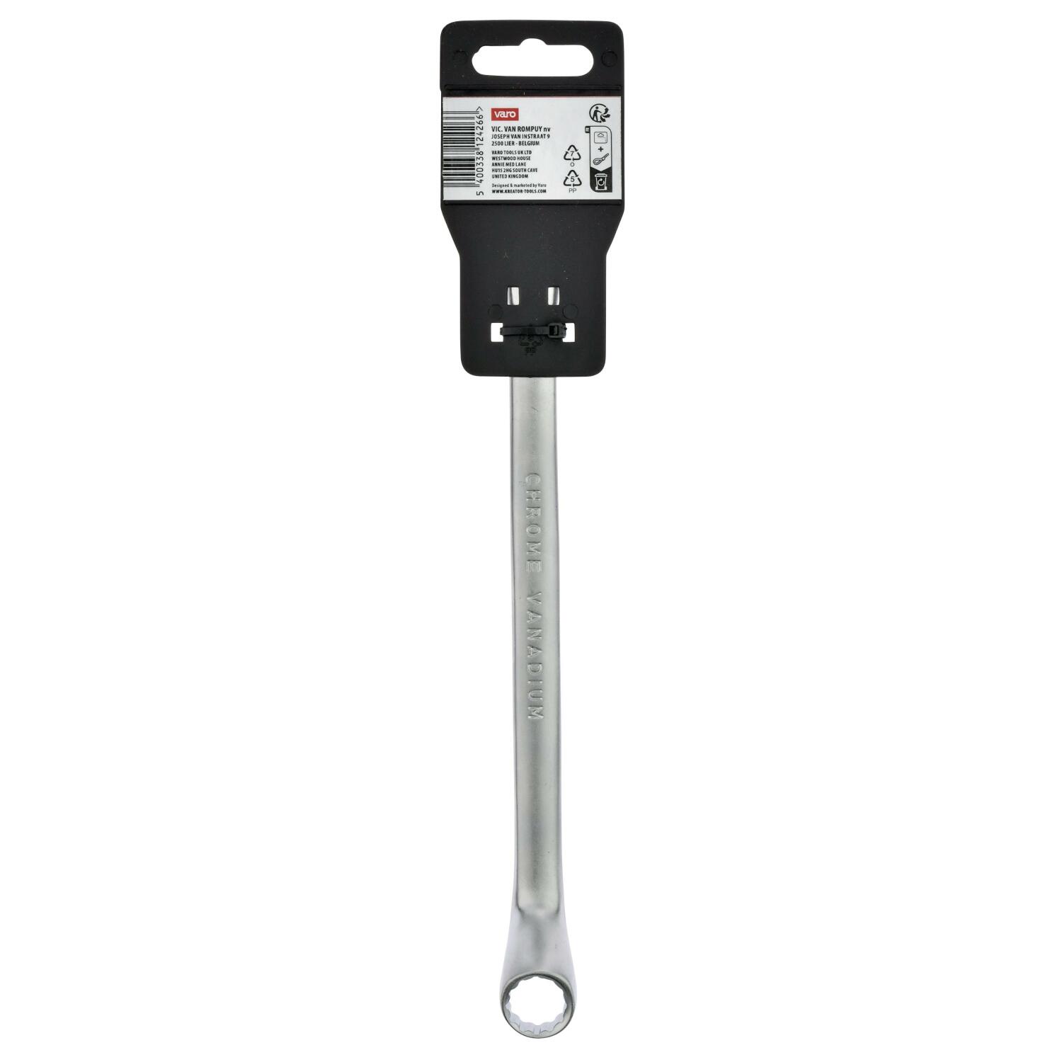 The double ring spanner by KREATOR is 175 mm long and made of high-quality chrome-vanadium. The offset rings ensure that the force you exert is transferred more efficiently. The ends have different sized openings; one is 14 mm wide and the other is 15 mm.