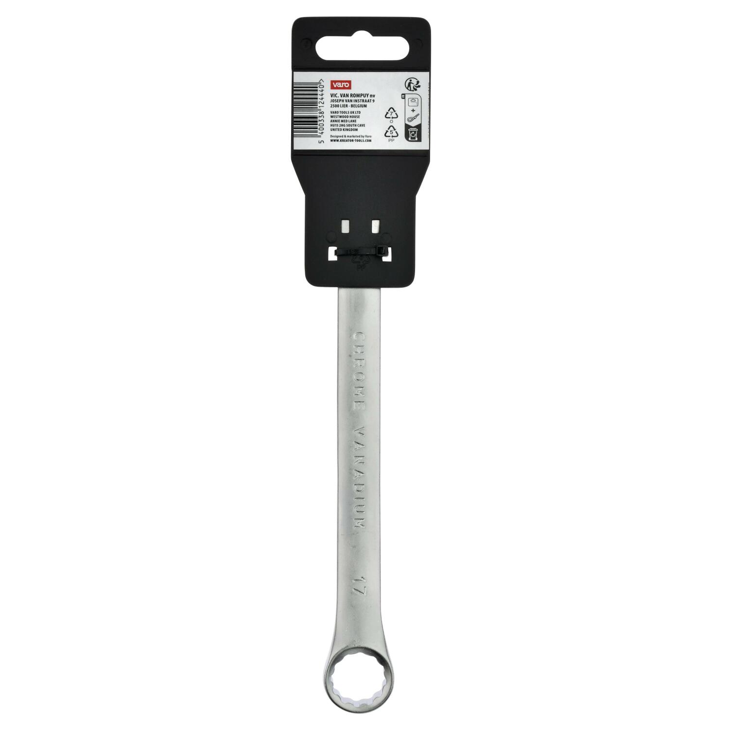 This combination open-end/ring spanner is made of sturdy chrome-vanadium. The elliptical shape of the shaft provides a better transmission of force. It measures 210 mm in length and has a ring size of 17 mm.