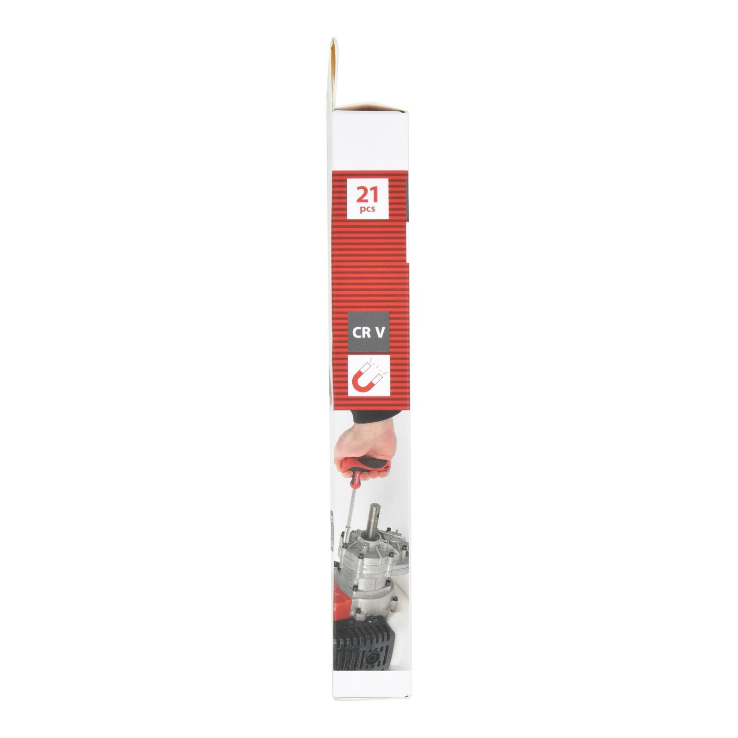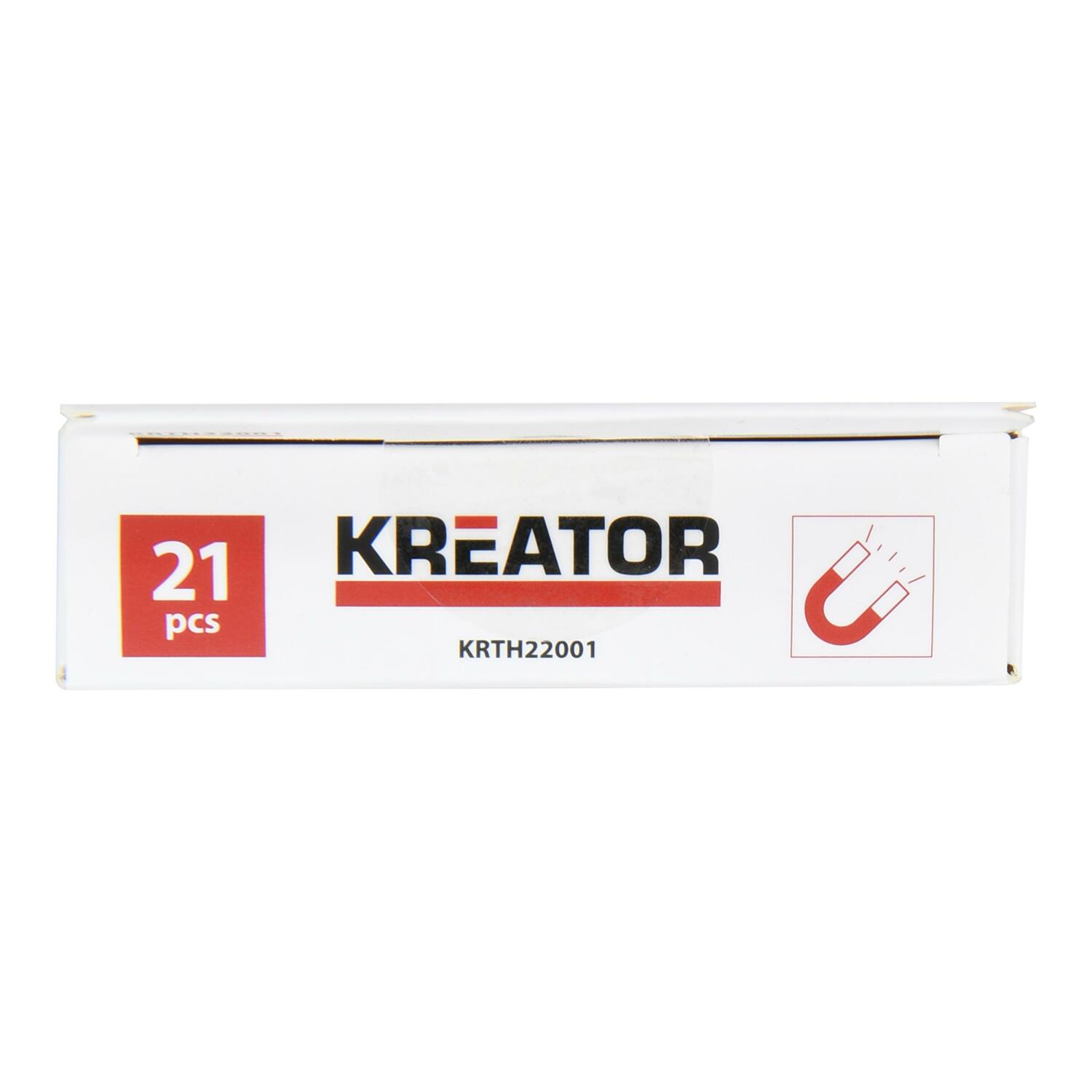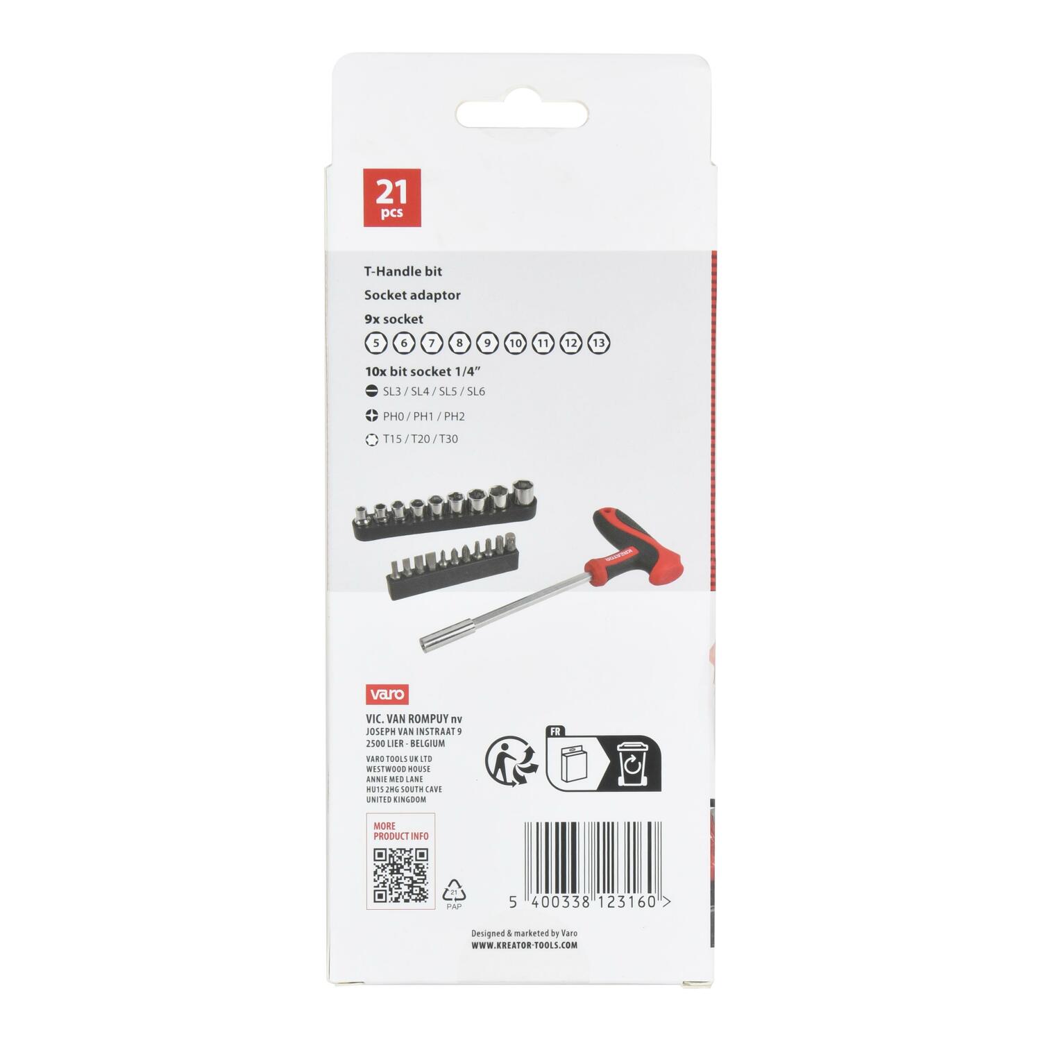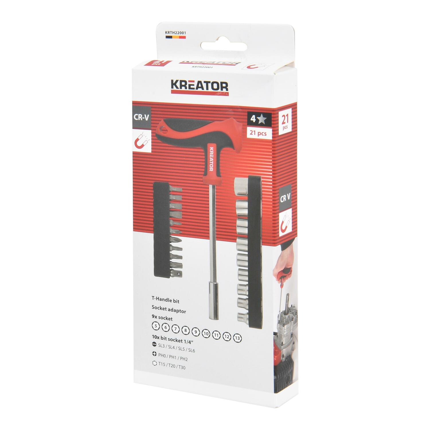 The T-handle screwdriver set 21 pcs from KREATOR, model KRTH22001, is an excellent choice for any project involving screws. This socket wrench and screw bit set includes a practical T-shaped screwdriver with a bit holder. The soft anti-slip handle provides a firm grip. The set also contains a wide selection of screw bits and socket wrenches.