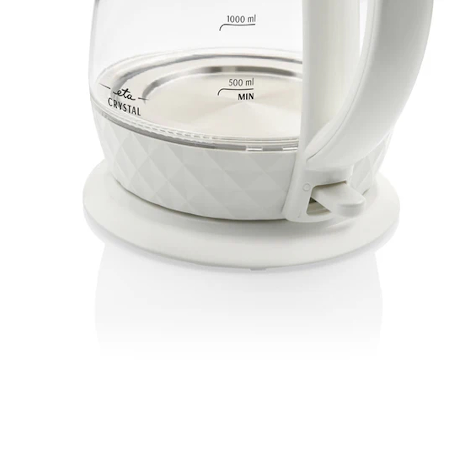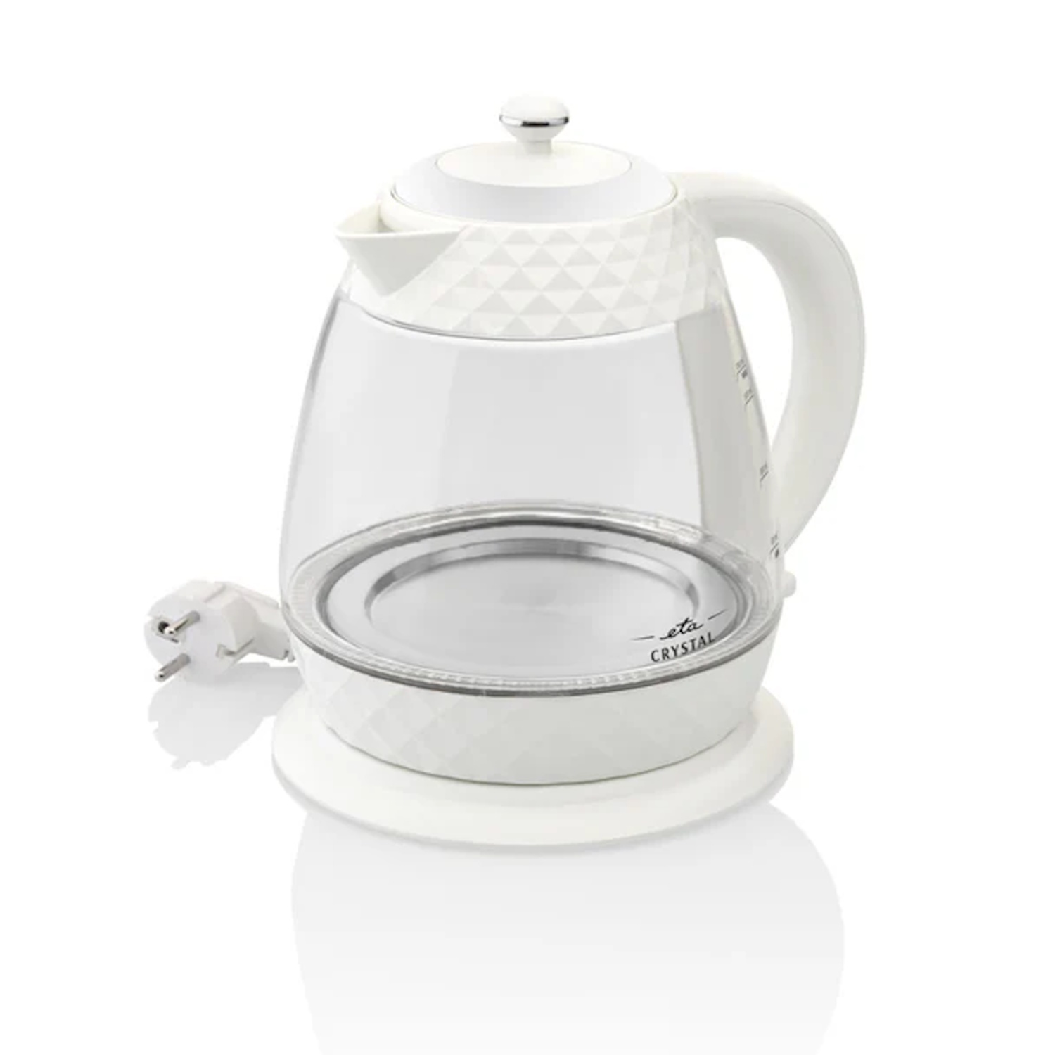 The ETA315490010 Crystal electric glass kettle with 2200 W power, 1.7 L capacity and a 360° rotating base provides fast boiling with a modern aesthetic thanks to its transparent glass body and illumination. The clean white design enhances any contemporary kitchen.