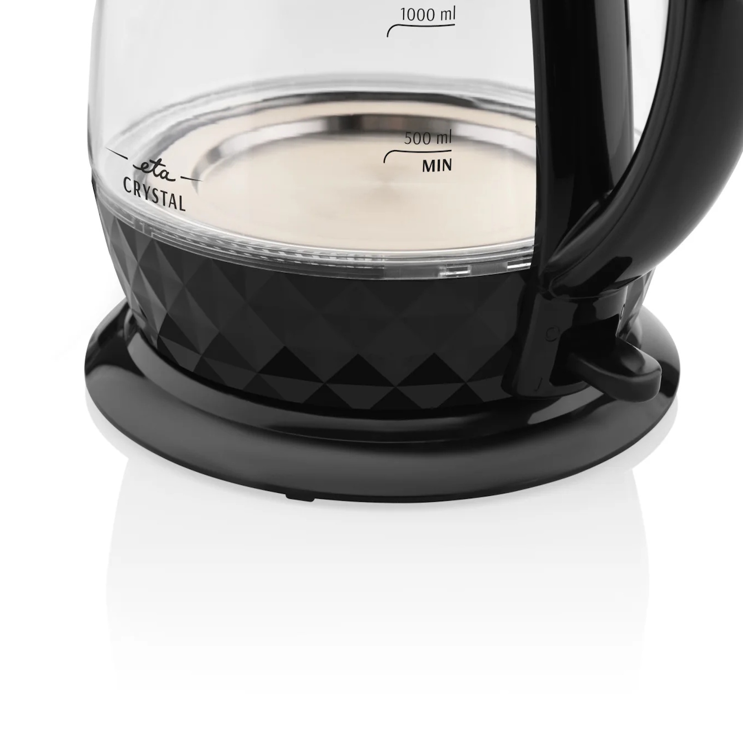 The ETA315490000 Crystal Glass/Black electric glass kettle, with 2200 W power, 1.7 L capacity, and a 360° rotating base, boils water quickly and adds a modern, transparent elegance to your kitchen. Its glass body, black accents and internal illumination make boiling water not just functional, but visually appealing — ideal for everyday home use or entertaining guests.