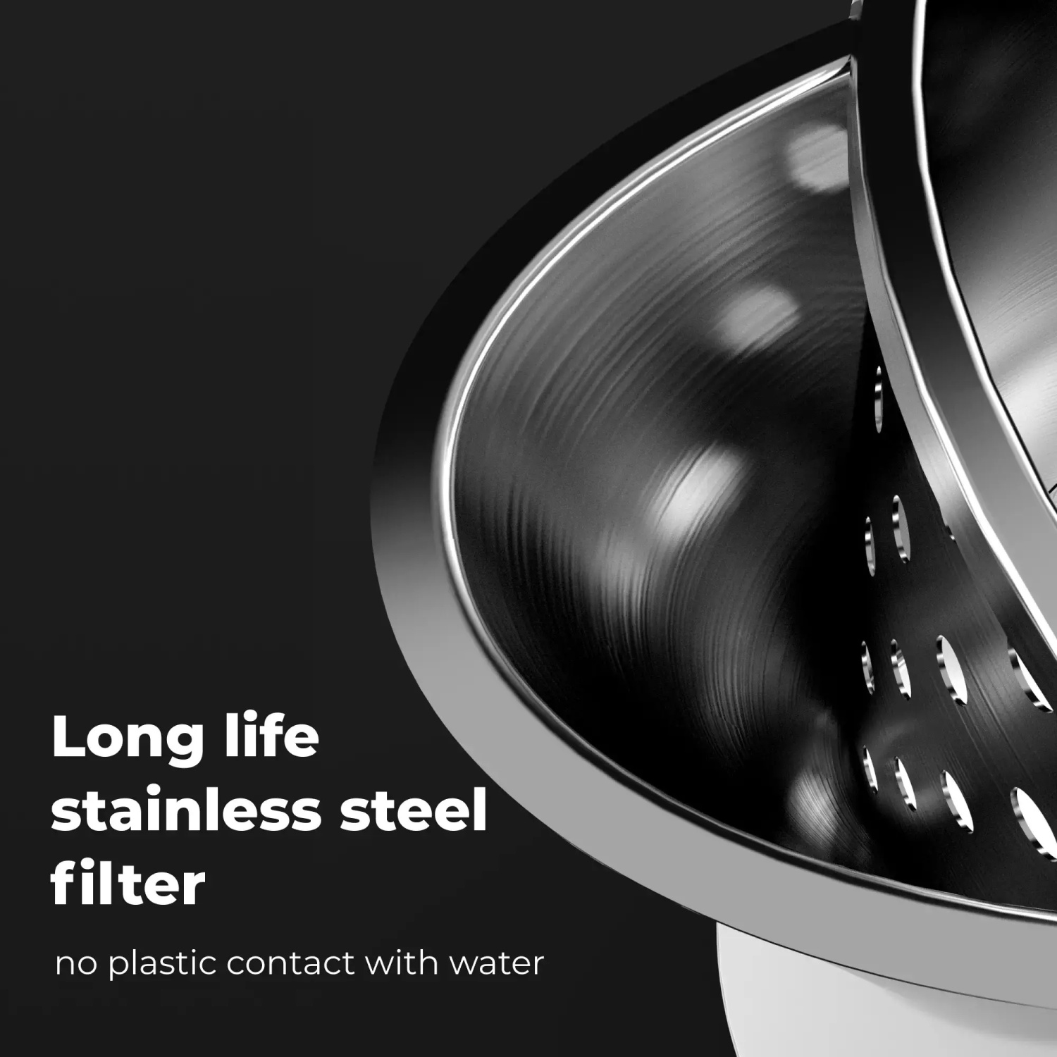 No plastic contact with water — seamless stainless-steel inner bowl.