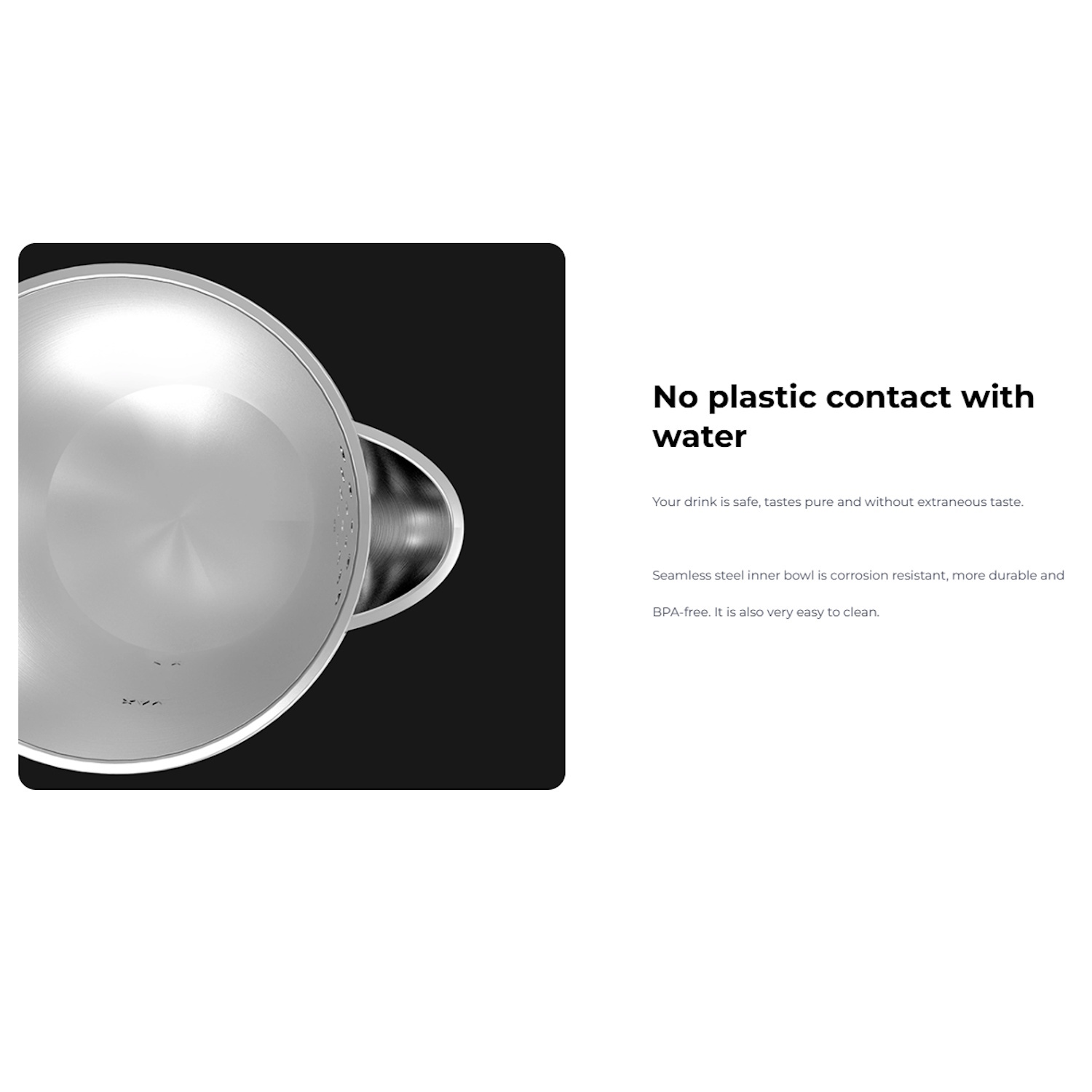 Seamless stainless-steel inner bowl — no plastic contact with water.