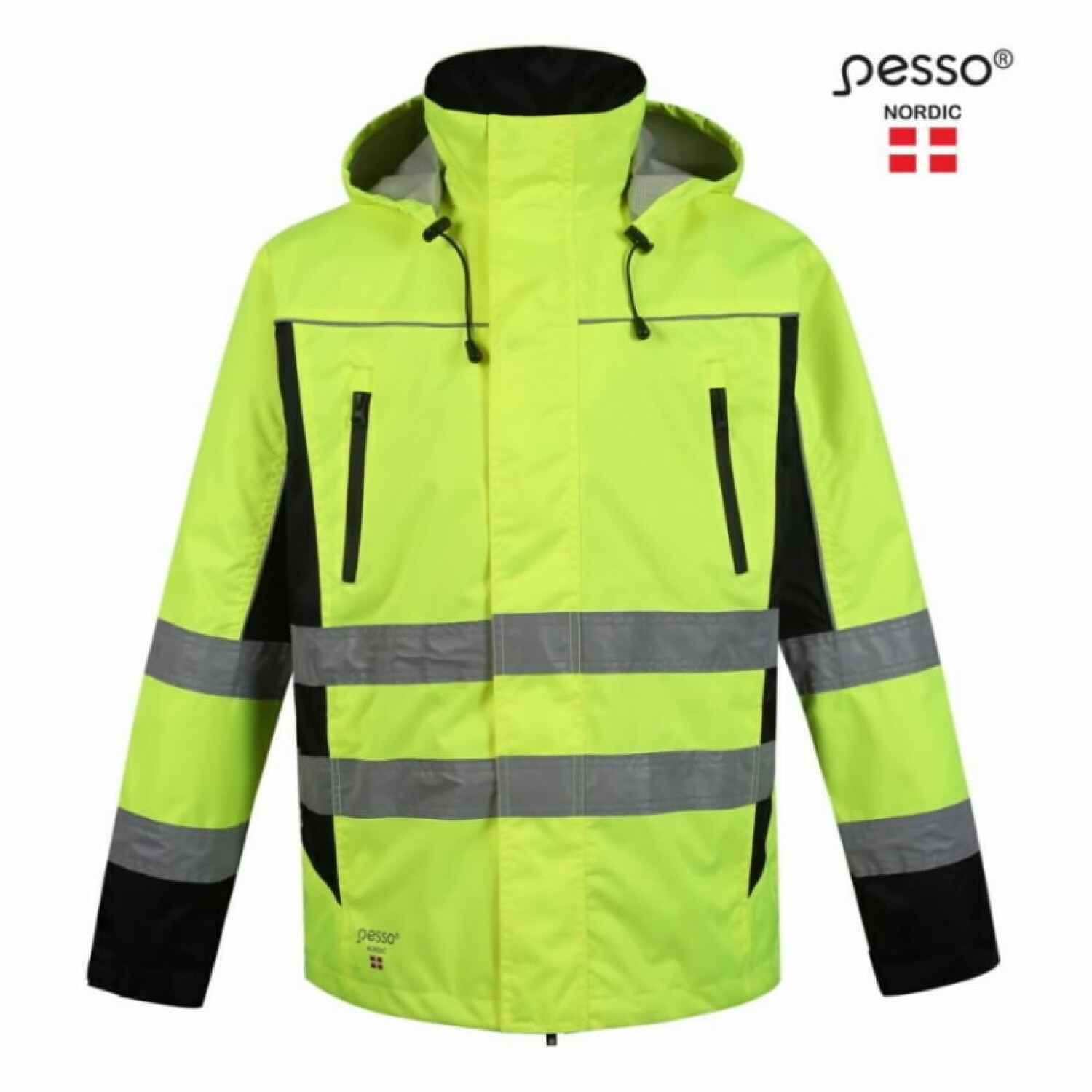 The PESSO Hi-vis Denver jacket, model DENVER_G-L, is designed for optimal visibility and protection while working in various conditions. This jacket is breathable, windproof, and waterproof, featuring taped seams for added durability.