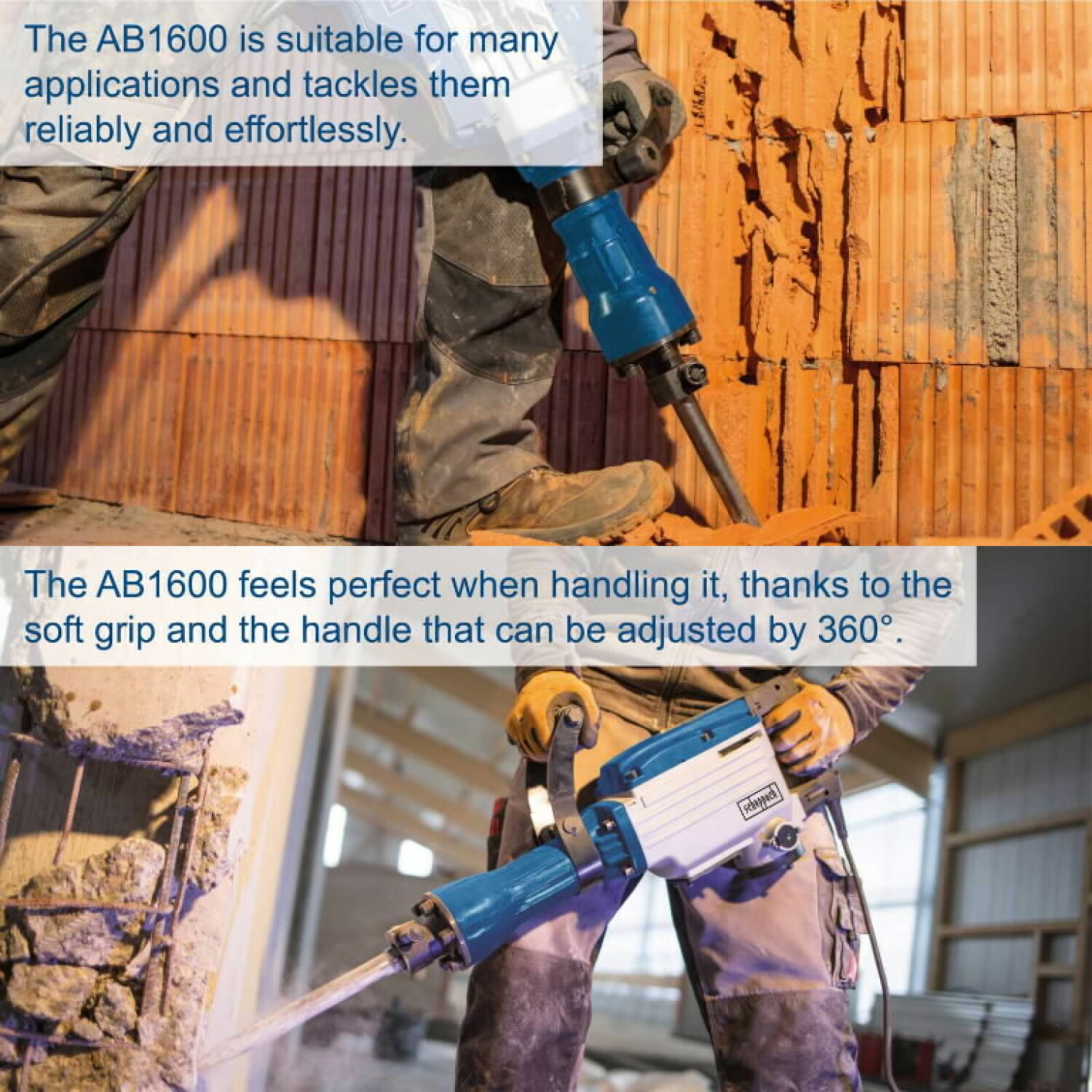 The SCHEPPACH AB 1600 demolition hammer is a powerful tool designed for heavy-duty tasks, perfect for breaking concrete and other hard materials.