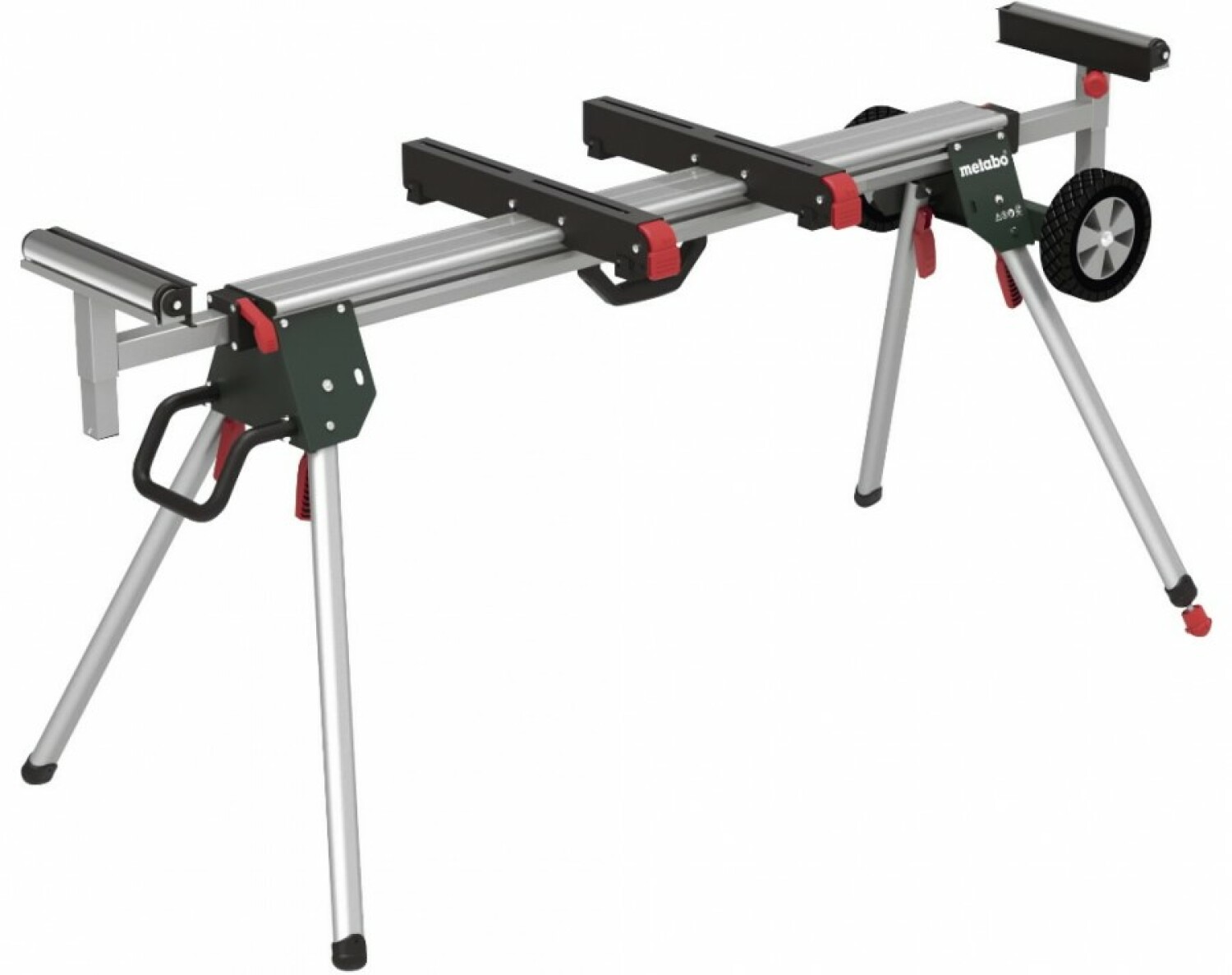 The Metabo KSU 401 Portable Saw Stand (model code 629006000) is a lightweight and durable solution for working with miter saws. It features wheels for easy mobility, even when a saw is mounted on it.