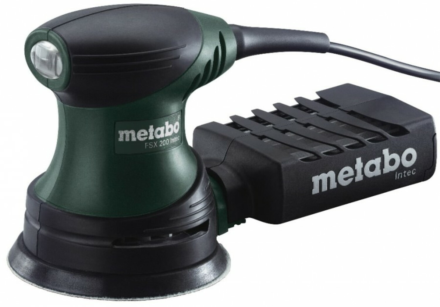 The non-slip rubber-coated handle is designed for vibration dampening, which ensures more comfortable use. It also features an Intec filter system for dust extraction, allowing for cleaner working conditions without the need for an external vacuum. A carrying case is included for convenient transport.