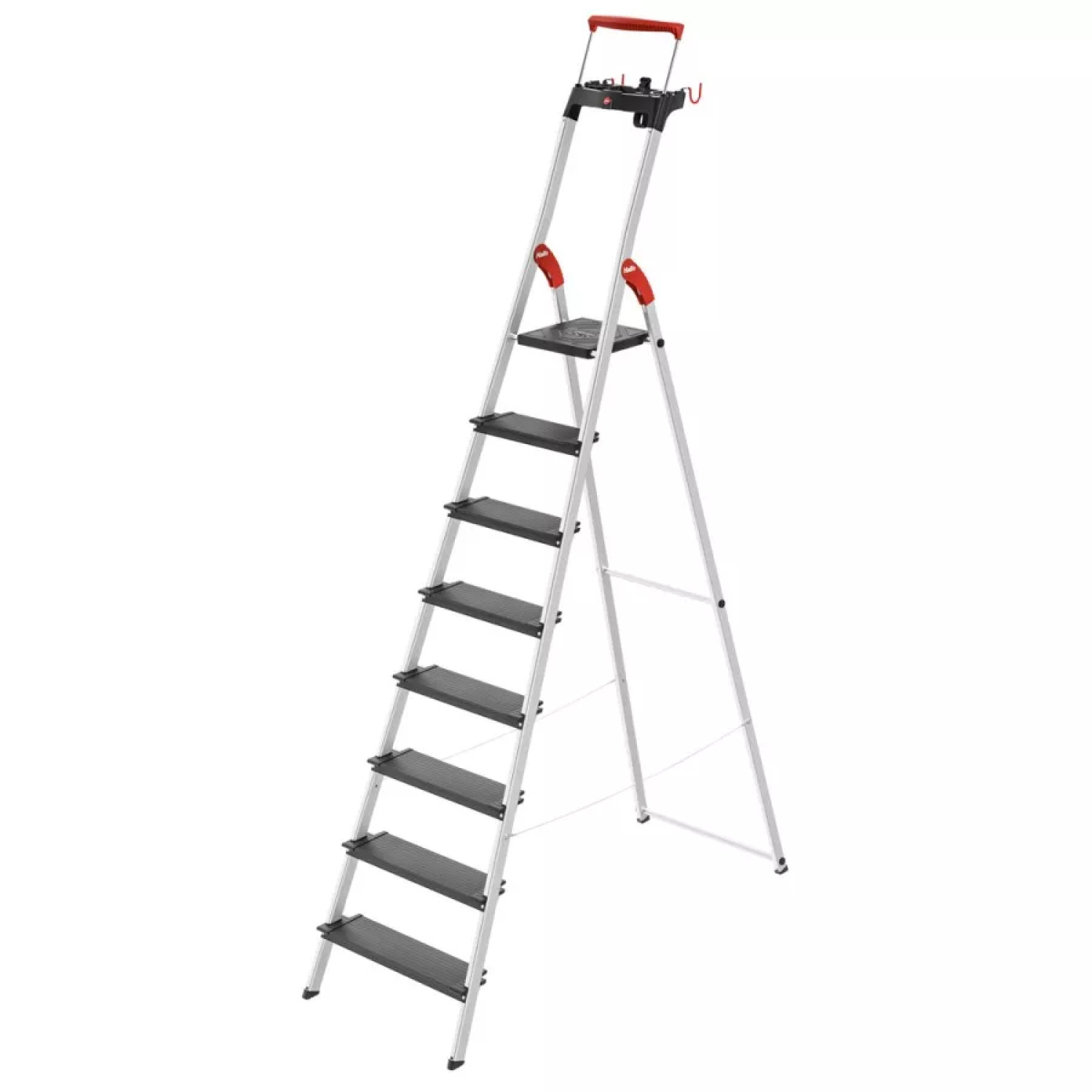 The HAILO Household Ladder L100 TopLine is a safe aluminium ladder equipped with a safety bracket, platform lock, and a multifunctional shelf. This ladder features extra deep and stable steps in XXL format, with a step depth of 130 mm.