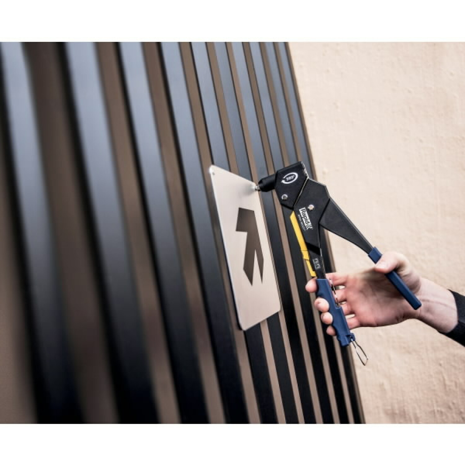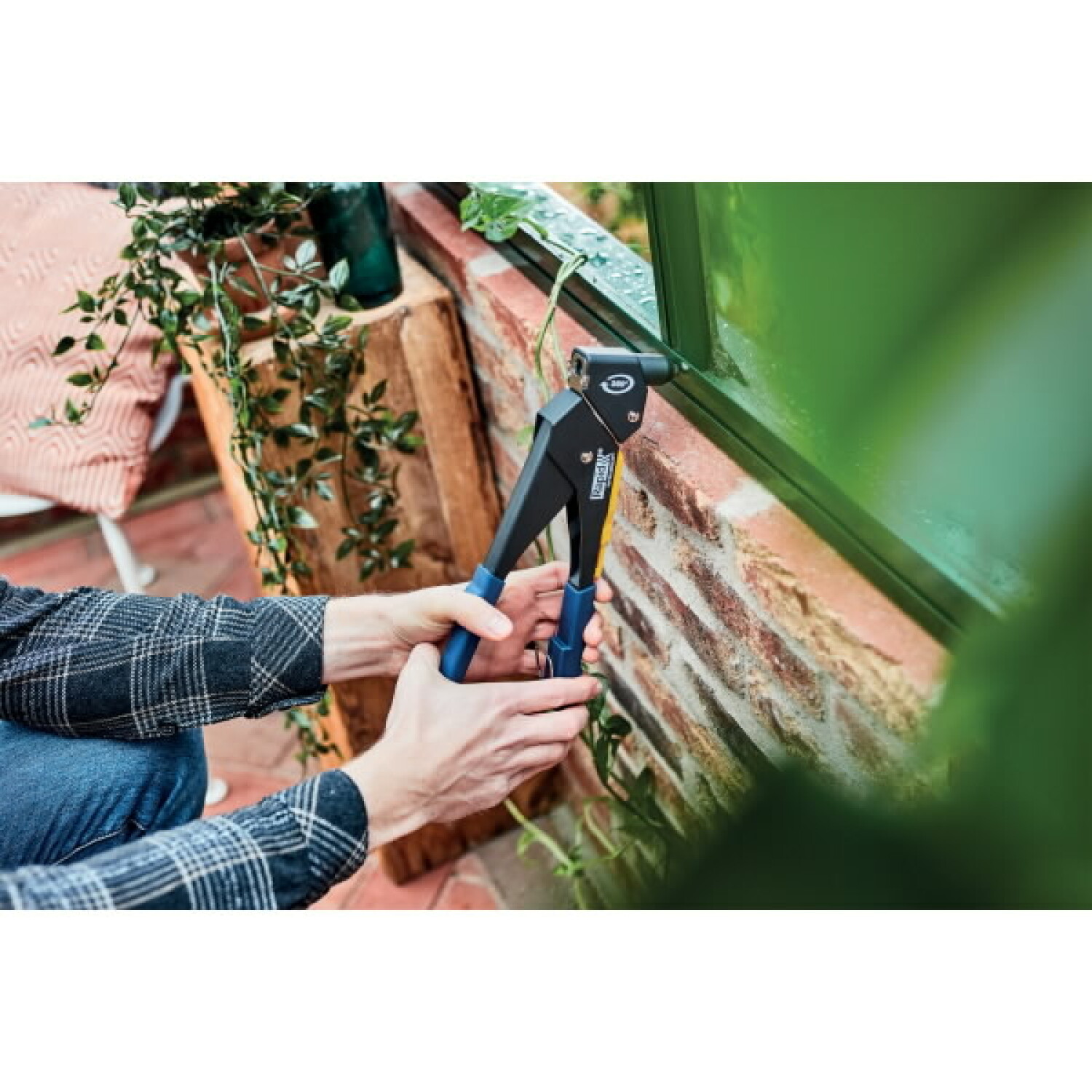 The RAPID RP60 MULTI hand riveter features a 360° rotating head, making it ideal for accessing tight spaces. This durable tool is suitable for aluminum rivets ranging from 3.2 to 4.8 mm. The handle is designed with a soft grip for maximum comfort during use.