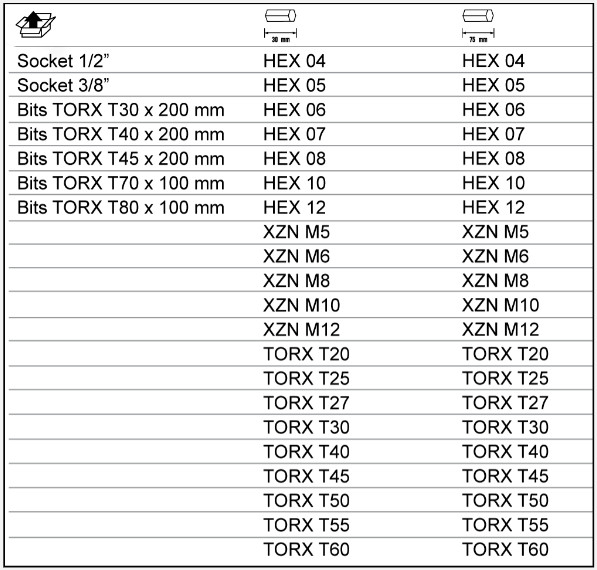 | Nozzle type | T25; T20; T27; T30; T40; T45; T50; T55; H4; H5; H3; H6; H8; H10; H12; H7; M5; M6; M8; T60; T70; M12; M10; T80 |
