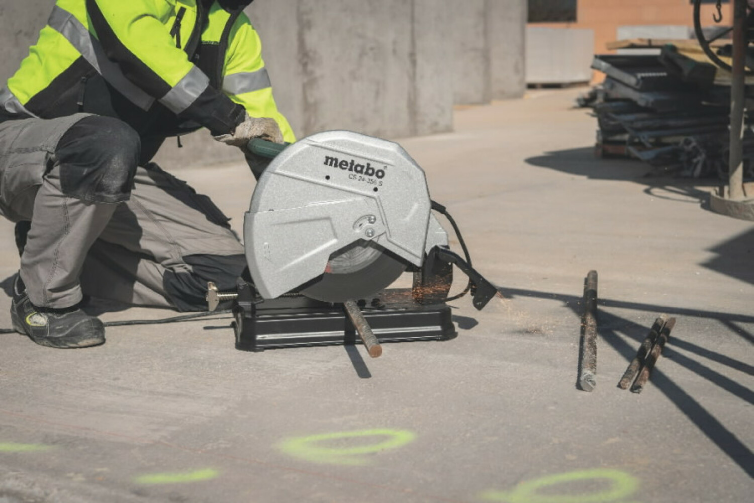 The METABO CS 24-355 S is a powerful metal cutting saw designed for quick and efficient cutting of steel, non-ferrous metals, iron, and cast iron profiles, pipes, and rods.
