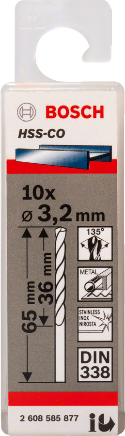 HSS-Co urbis metālam 3,2mm, 10 gab., Urbjmašīnām/skrūvgriežiem PRO STAINLESS STEEL HSS-CO SPIRĀLVEIDA URBIS, 2608585877, BOSCH