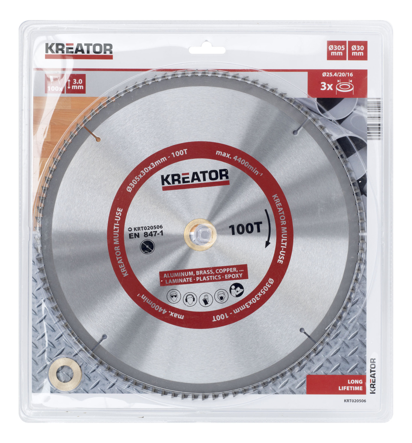 KREATOR ringsaagiteras, mudel KRT020506, on universaalne karbiidist tera, mis sobib kasutamiseks erinevate ringsaagide, lõike- ja nurkade saagide juures. Tera diameeter on 305 mm ning sellel on 100 hammast, mistõttu sobib see ideaalselt erinevate materjalide, sealhulgas laminaadi, parketi, mitteferro metalide (nagu vask, pliim, alumiinium ja messing), sünteetiliste materjalide, epoksiidi, puidu ja muude materjalide lõikamiseks. Tera eritootmine alumiiniumistis terasest tagab pika eluea, optimaalse jahutuse ja täpse lõike.