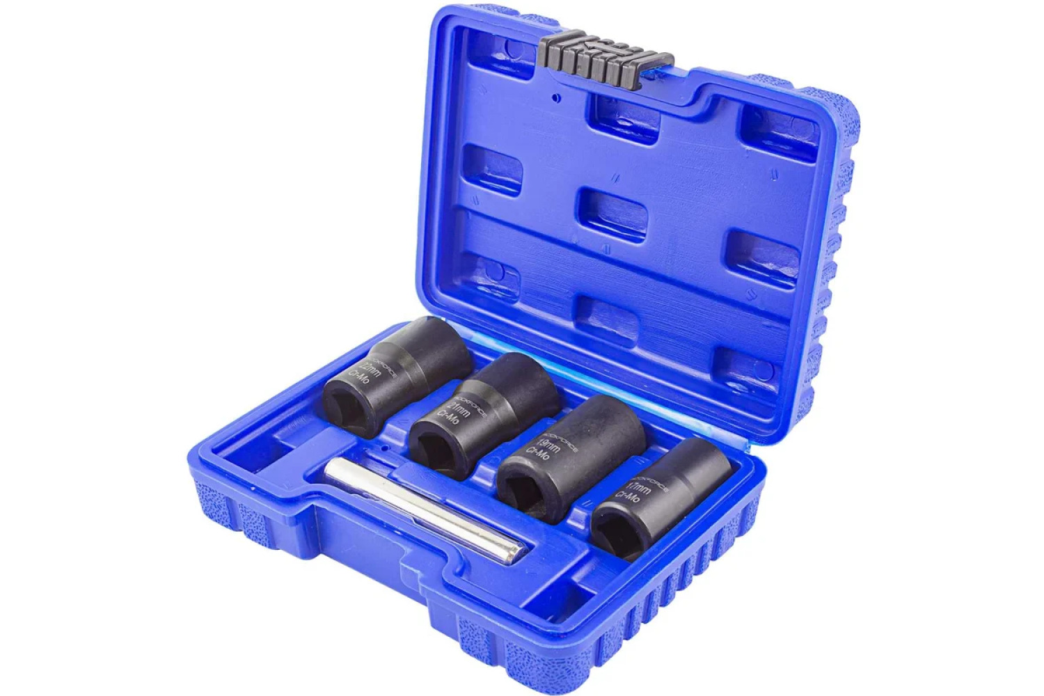 Kõik komplekti elemendid on valmistatud kõrgekvaliteedilisest kroom-molübdeeni terasest ja sobivad kasutamiseks löökriistadega. Komplekt sisaldab ekstraktoreid suurustes 17, 19, 21, 22 mm ning poistamisterast, et hõlbustada jääkide eemaldamist pärast kruvide lahti keeramist. Mugava ladustamise ja organisatsiooni tagamiseks on tööriist pakitud löögikindlasse karpi.