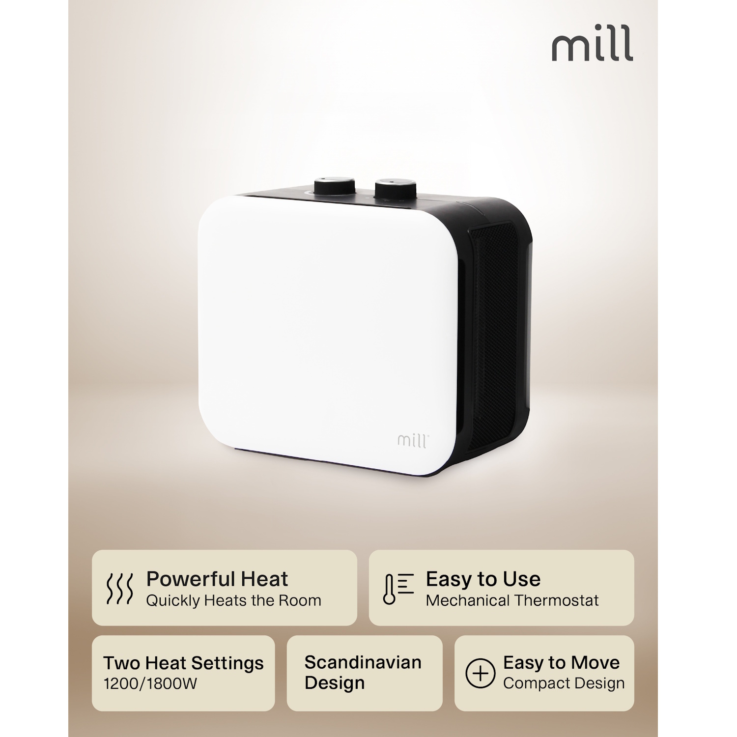 Mill CUS1800MECW on kaasaegne PTC-ventilaatoriga kütteseade 1800 W võimsusega, WiFi-juhtimise ja kolme kütterežiimiga. Sobib 10–30 m² ruumidele. Tagab kiire soojenemise, ühtlase soojajaotuse ja mugava nutijuhtimise. Valge disain sobib hästi modernsesse interjööri.
