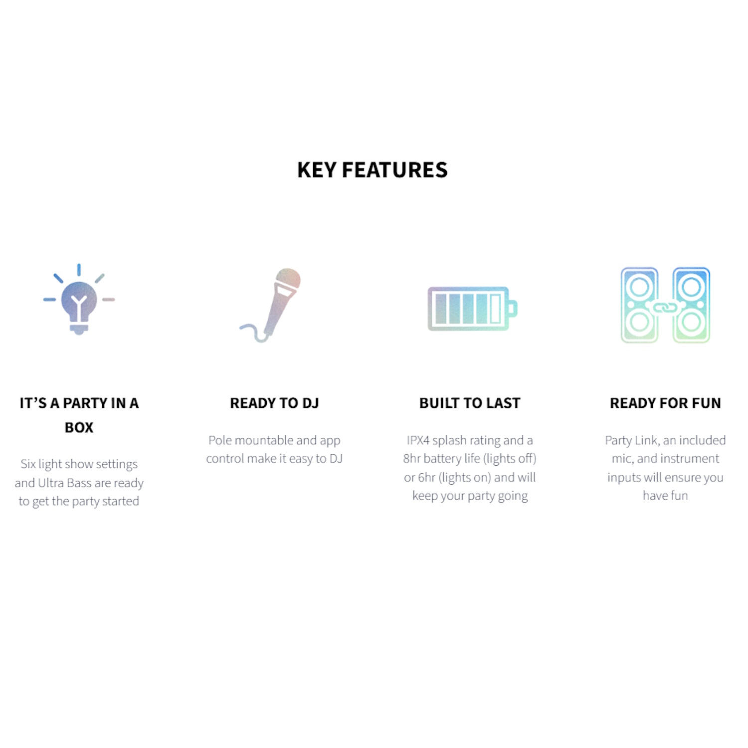 Võimas peokõlari heli → vali ja külluslik heli pidude jaoks