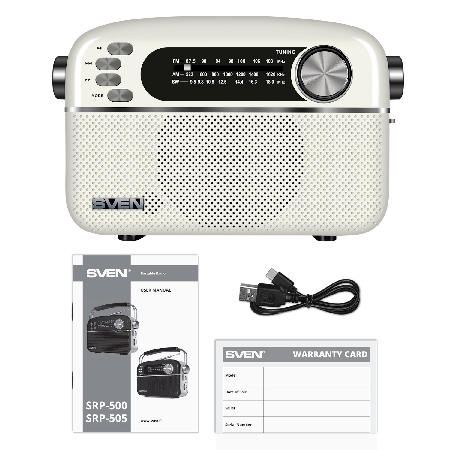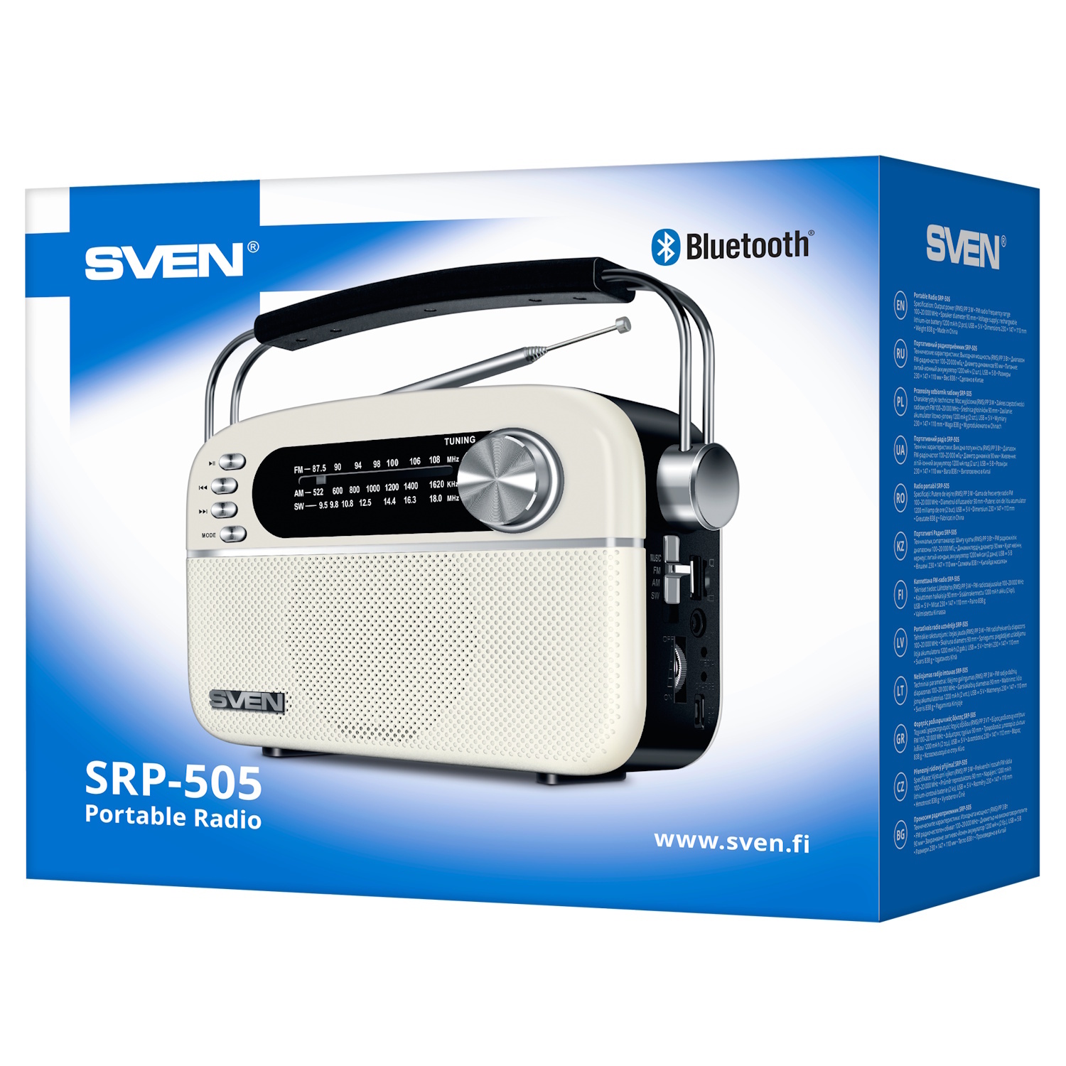 Retrostiilis kaasaskantav raadiokõlar SVEN SRP-505 ühendab klassikalise disaini kaasaegsete taasesitusvõimalustega. Seade toetab Bluetoothi juhtmevaba ühendust, FM / AM / SW raadiovahemikke ning muusika esitust USB-mälupulkadelt ja microSD-kaartidelt. Sisseehitatud aku tagab autonoomse töö, muutes seadme sobivaks nii koduseks kasutamiseks kui ka kaasa võtmiseks.
