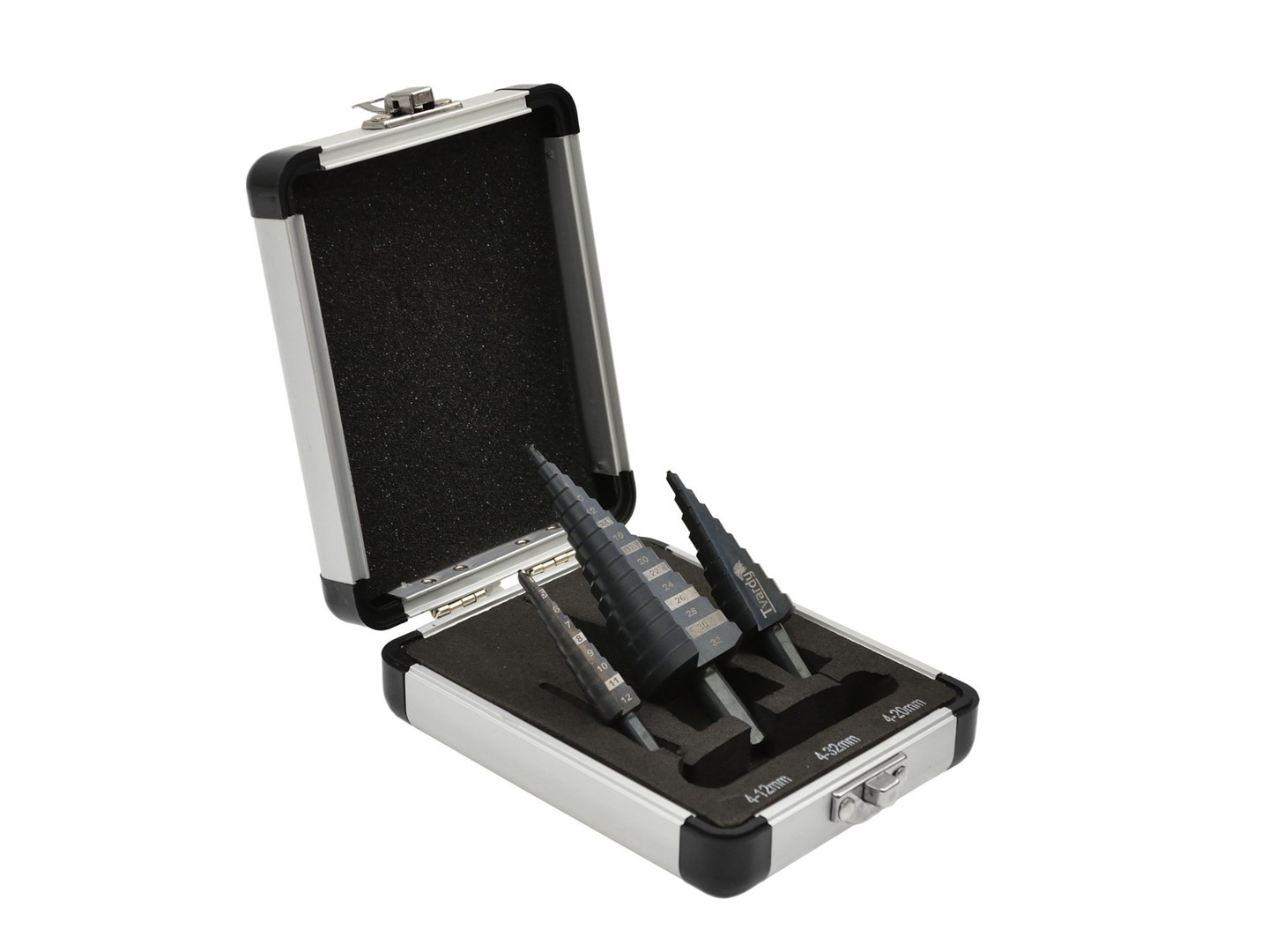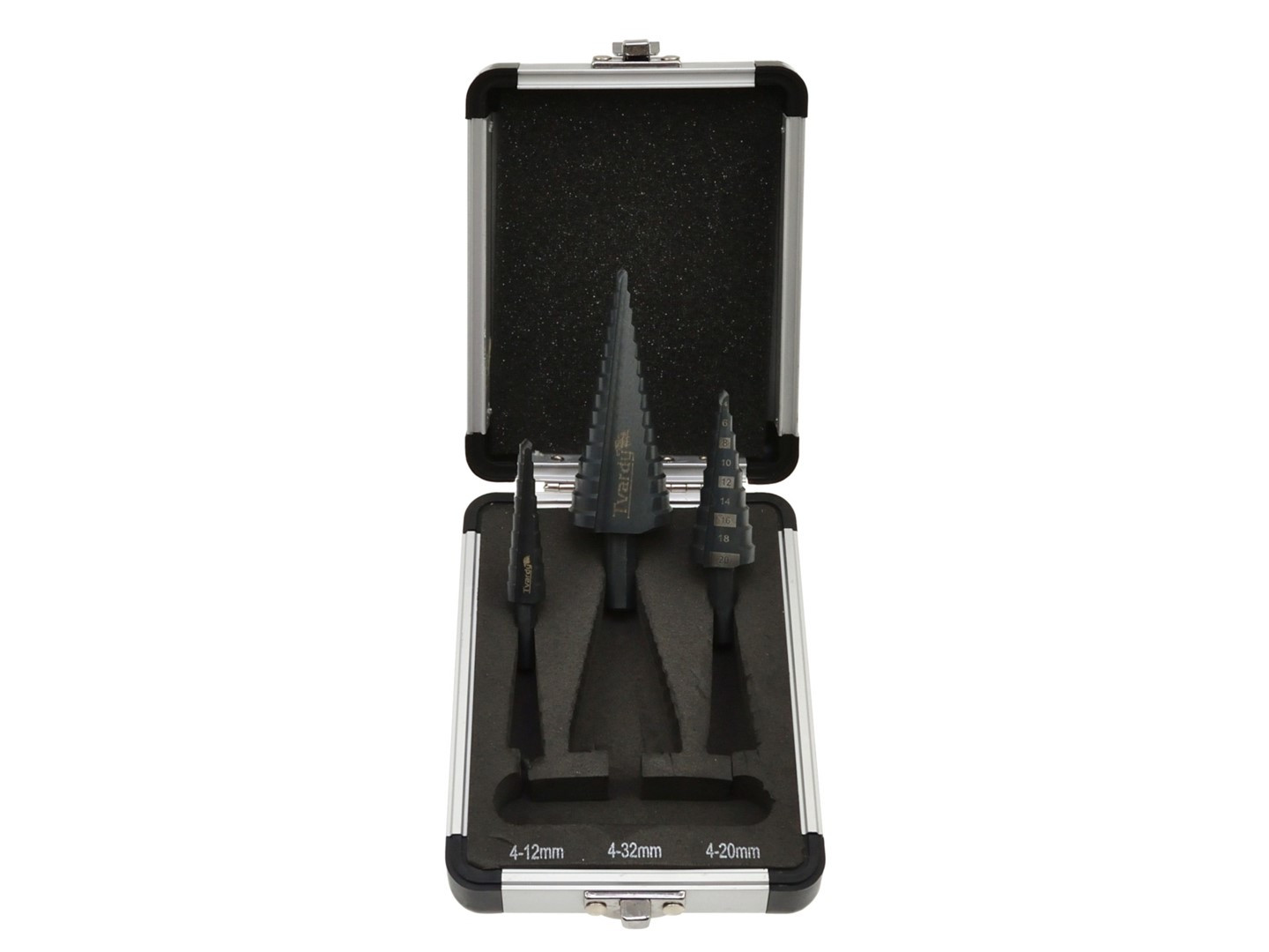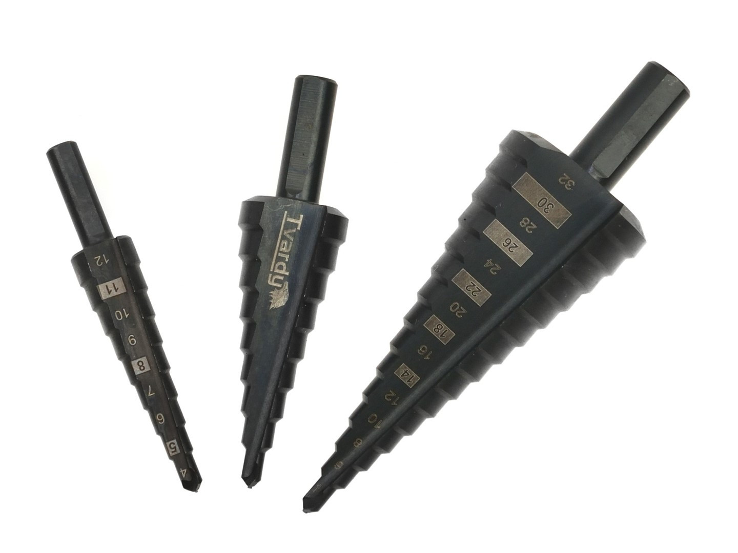Profesionālo instrumentu zīmola Tvardy pakete pakāpju urbjiem, izgatavota no augstas kvalitātes HSS M2 ātrgriezējtērauda. Urbji 4-20mm un 4-32mm pakāpeniski katrus 2 mm, bet 4-12mm pakāpeniski katrus 1 mm. Tie ir aprīkoti ar cilindriskām uzmavām un skaidru numerāciju. Paredzēti metālu, plānu tērauda loksņu un plastmasas urbšanai.