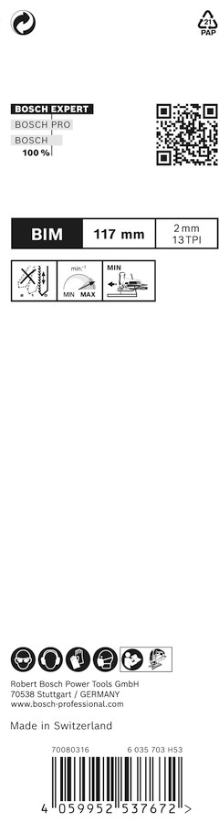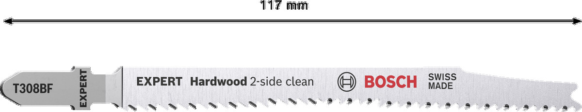 No bimetāla izgatavotais Bosch EXPERT Hardwood 2-side clean figūrzāģa asmens – ātrgriešanas tērauda loksne, kas piestiprināta pie elastīga tērauda asmens, apvienojot izturību un elastību, ir pietiekami spēcīgs laminētas virtuves letes kokskaidu plātnes vai lapkoku koksnes griešanai. Pieejams zāģēšanai bez plaisām (T308BF) un īpaši precīzai leņķa zāģēšanai bez plaisām (T308BFP).