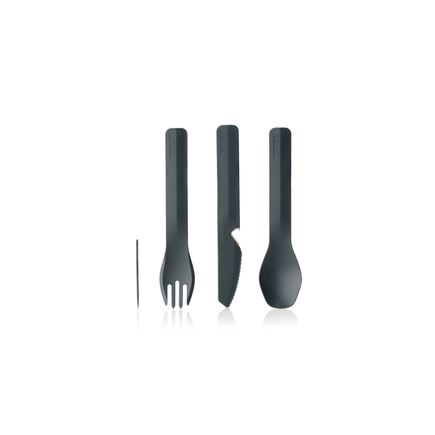 Ceļojumu galda piederumi ar jaunu dizainu: kompakta transporta kaste nodrošina piekļuvi katram komplekta elementam un aizsargā tos higiēniski. 'Trio' komplektā ir dakša ar izcilām 'dzeltenēm' un 'šķelšanās' funkciju (mīkstiem ēdieniem), karote ar mīkstiem un ērtām malām, kā arī nazis ar izliekto asmeni. Tas nodrošina labu griešanas veiktspēju, kas ir pietiekama mīkstam gaļai. Nazī ir iebūvēts pudeļu atvērējs, un komplektā ir arī zobu bakstāmais. Viegli tīrāms un ērti pārnēsājams.