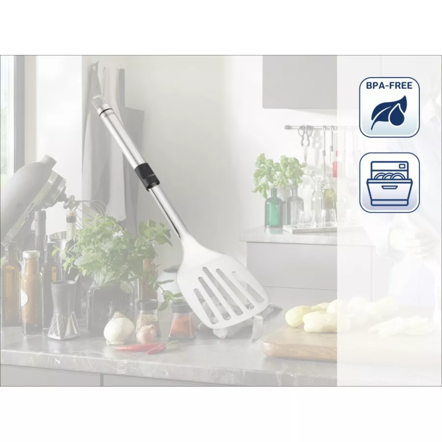 Augstas kvalitātes nerūsējošā tērauda kombinācija ar melnu plastmasu ir dizaina izcelšana katrā virtuvē un ir ideāli piemērots servēšanai uz galda. ProLine neilona lāpstiņas ovālas formas rokturis ir izgatavots no augstas kvalitātes nerūsējošā tērauda, nodrošinot drošu un ērtu lietošanu ar patīkamu stabilitāti. Prece ir aprīkota ar praktisku cilpiņu, lai to varētu pakārt pie atsevišķi pieejama ProLine āķa sliedes.