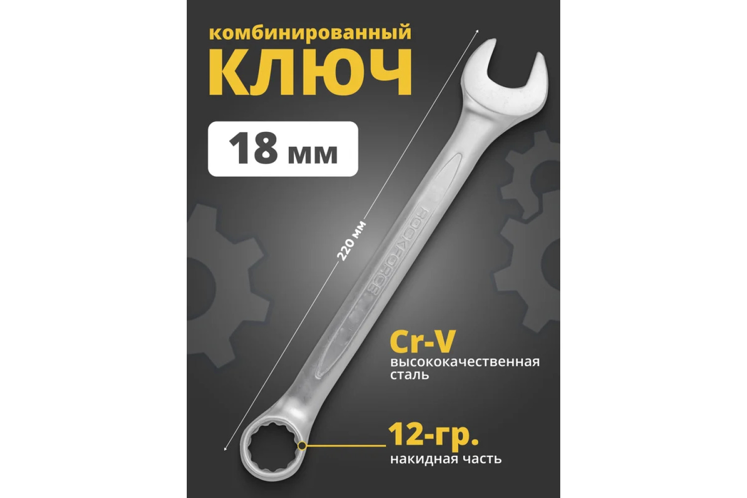 Kombinētā uzgriežņu atslēga 18 mm no zīmola ROCKFORCE (modelis RF-75518) ir ideāli piemērota montāžai un demontāžai, kā arī uzgriežņu un skrūvju pievilkšanai un atskrūvēšanai.