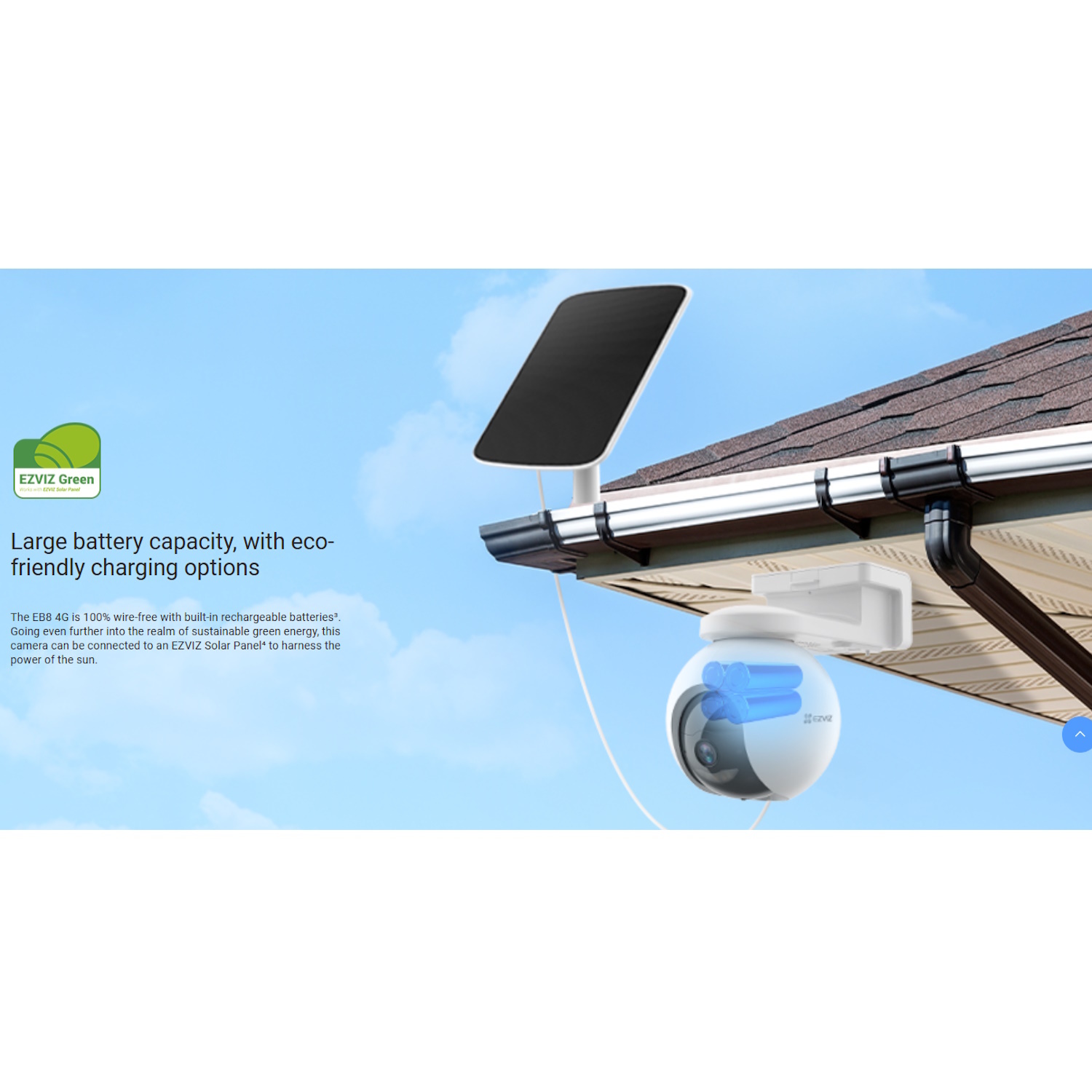 Saules panelis nodrošināta nepārtraukta darbība – EZVIZ saules panelis E uztur jūsu kameru uzlādētu, izmantojot atjaunojamo enerģiju, samazinot apkopi un pagarinot akumulatora mūžu.