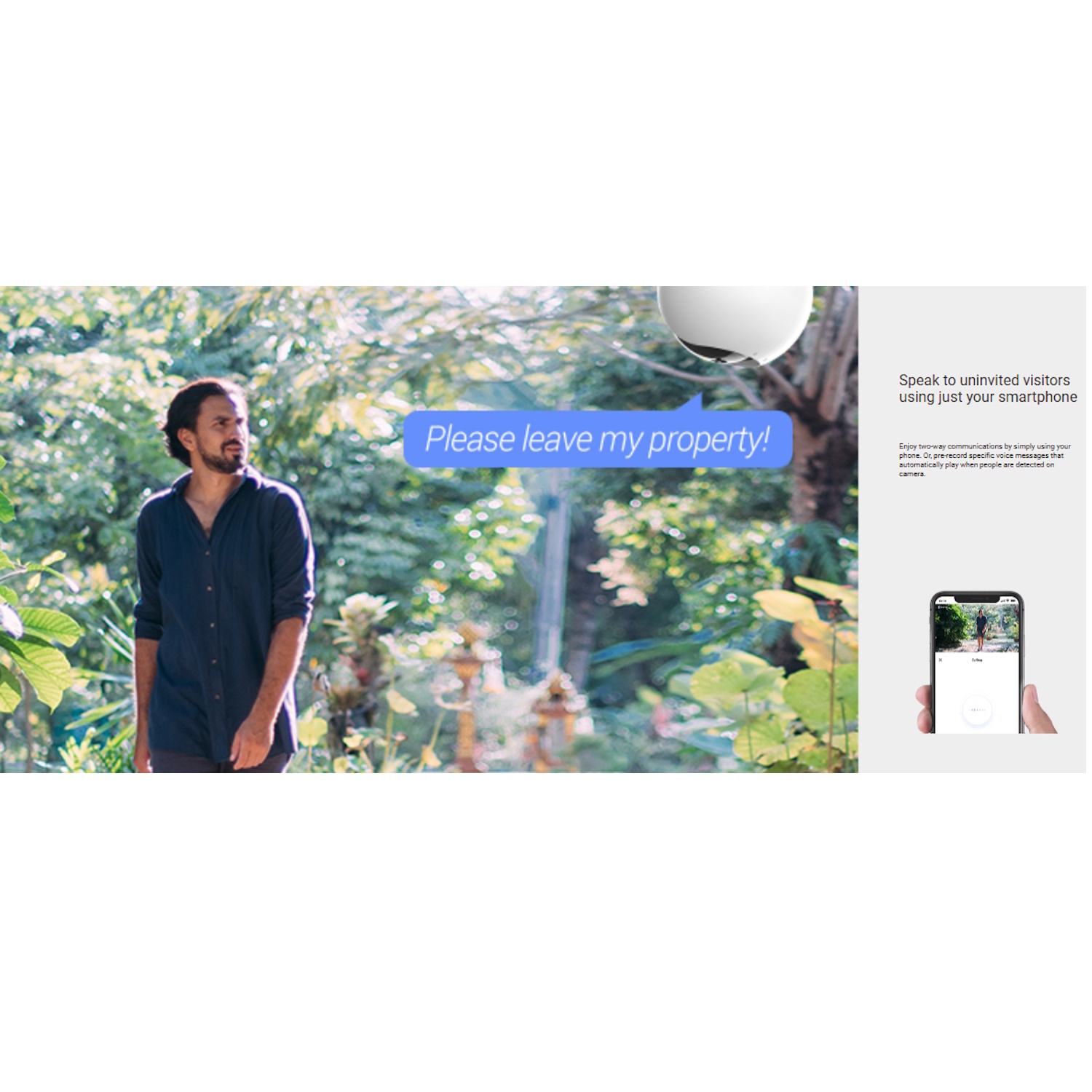 Divvirzienu saziņa un pielāgotas balss brīdinājumi – Sazinieties ar apmeklētājiem tieši no sava telefona, vai iestatiet pielāgotus balss ziņojumus, lai automātiski atskaņotu, kad tiek noteikta kustība.