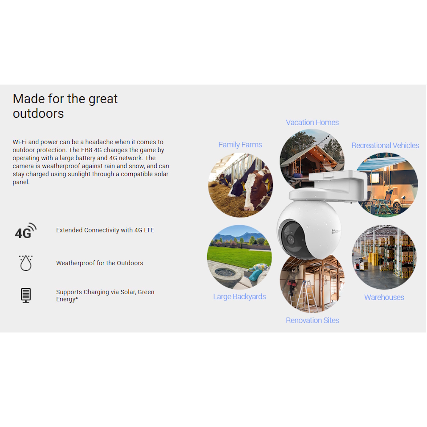 Ar 4G LTE savienojamību, AI darbinātu kustības noteikšanu un pilnībā motorizētu 360° pārklājumu EB8 kamera nodrošina augstas izšķirtspējas uzraudzību dienā un naktī. EZVIZ saules panelis E novērš biežu uzlādi, ļaujot ilgtspējīgu darbību ar saules enerģiju. Neatkarīgi no tā, vai tiek nodrošināti būvniecības objekti, lauksaimniecības zemes, atvaļinājumu mājas vai attālie perimetri, šis ekoloģiskais, viedais drošības sistēmas risinājums ir izstrādāts, lai nodrošinātu uzticamību.