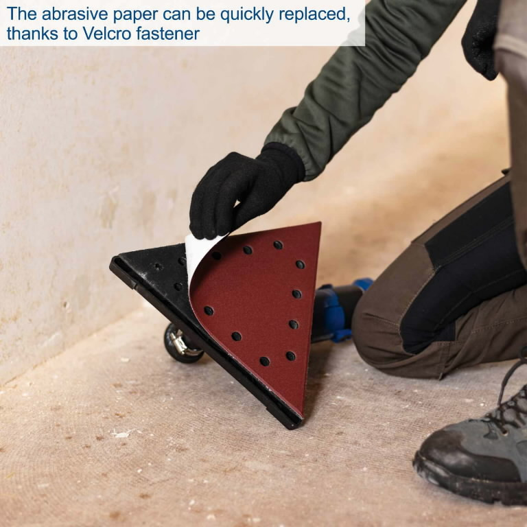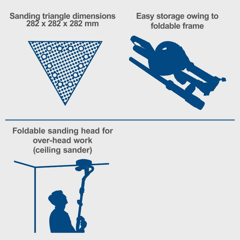 Apaļā 225 mm diametra un trīsstūra formas galvas 282 x 282 x 282 mm slīpēšanas virsma ļauj apstrādāt lielus laukumus.