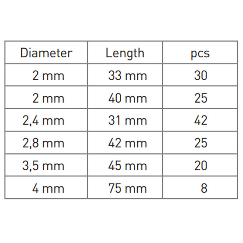 | Izmērs | 2.4 x 31 mm; 2 x 33 mm; 2 x 40 mm; 2.8 x 42 mm; 3.5 x 45 mm; 4 x 75 mm |