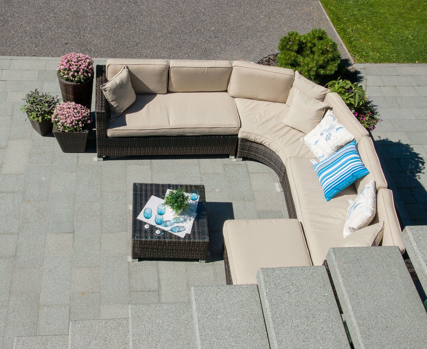 Komplektā ietilpst 4 sēdekļu spilveni, 6 atzveltnes spilveni un 4 mazi dīvāna spilveni.