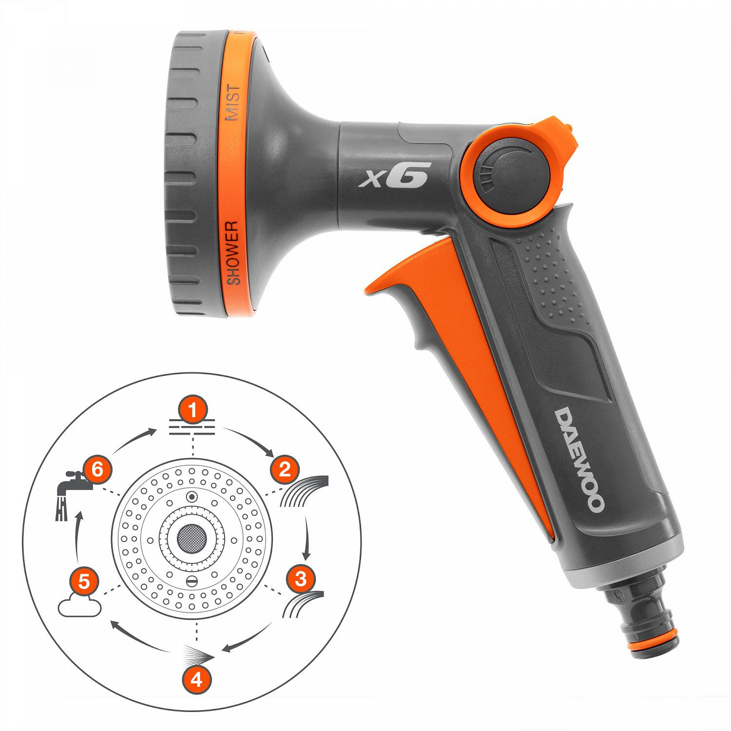 6 purkštukų tipai leidžia pasirinkti optimalų režimą bet kokių paviršių valymui ir atsargiam laistymui.