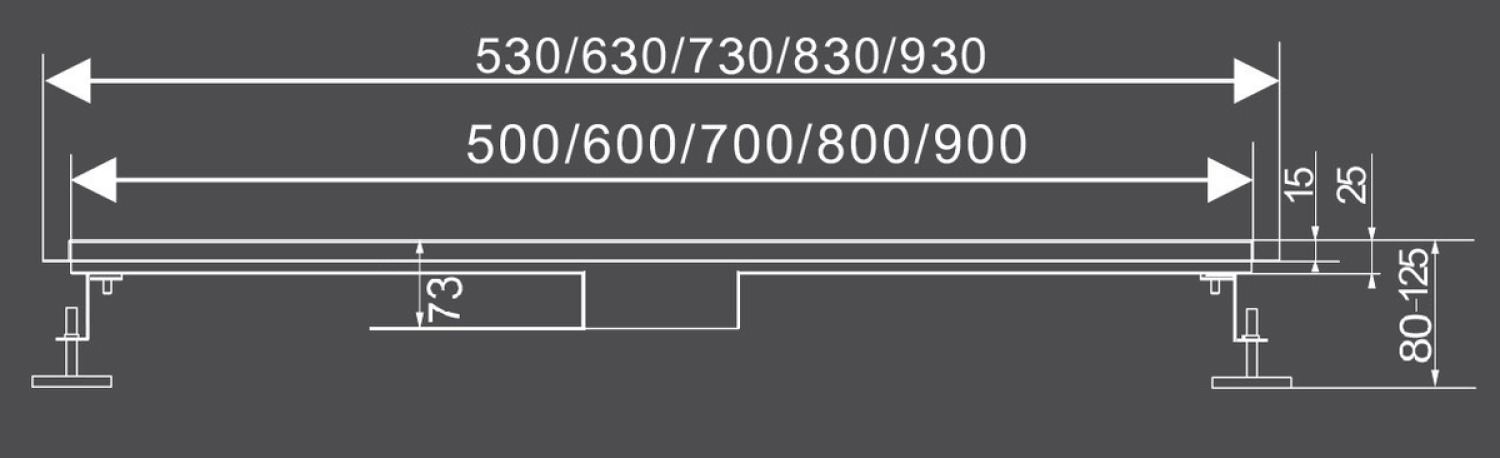 Platus galimų dydžių asortimentas leidžia optimaliai pritaikyti jo ilgį prie dušo kabinos ar plytelių matmenų, suteikiant daugiau laisvės planuojant dušo erdvę nei tradiciniai dušo padėklai.