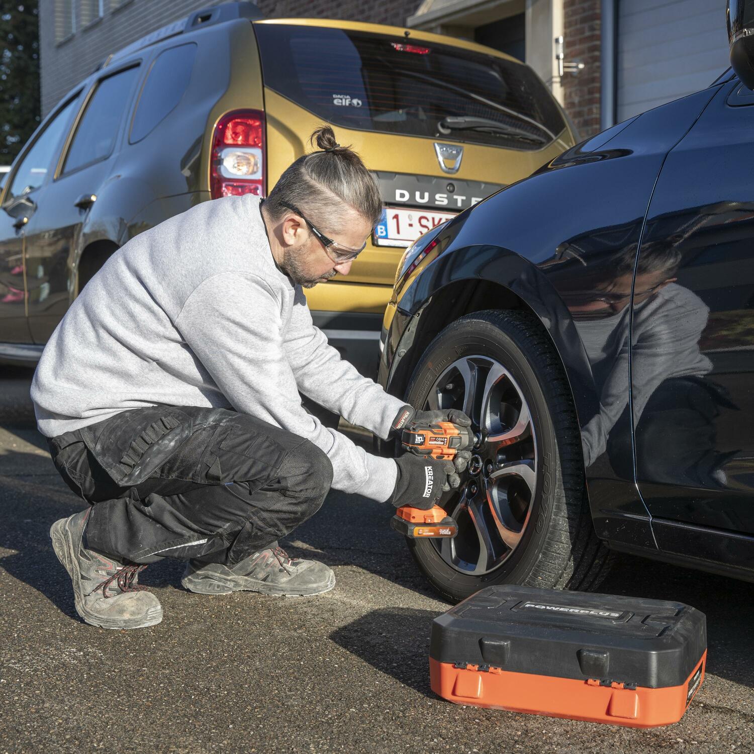 Naudokite šį akumuliatorinį smūginį veržliasukį, kad efektyviai sukurtumėte arba atsuktumėte veržles ir varžtus. Pavyzdžiui, galite jį naudoti automobilių padangų varžtams. Dėl didelio sukimo momento, siekiančio 220 Nm, reikia minimalios pastangos.