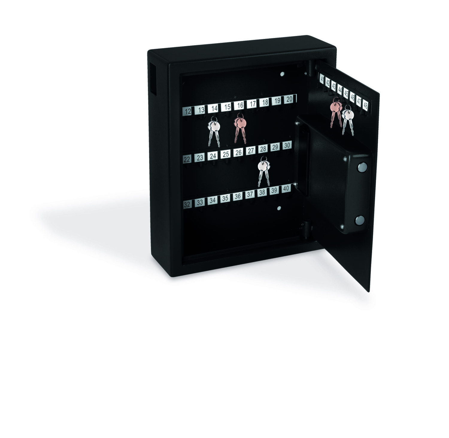 Ši diskreti, sustiprinta raktų spinta KREATOR KRT692048 gali talpinti 48 raktus. Seifas turi šoninį atidarymą, leidžiantį palikti raktus nesprinčiant spintos. Tai naudinga viešbučio svečiams, norint saugiai palikti raktus išvykstant. Spinta gali būti atidaryta naudojant elektroninį kodą arba avarinius raktus. Naudokite galinėje pusėje esančius tvirtinimo varžtus, kad pritvirtintumėte seifą prie sienos arba pastatytumėte jį drabužių spintoje.