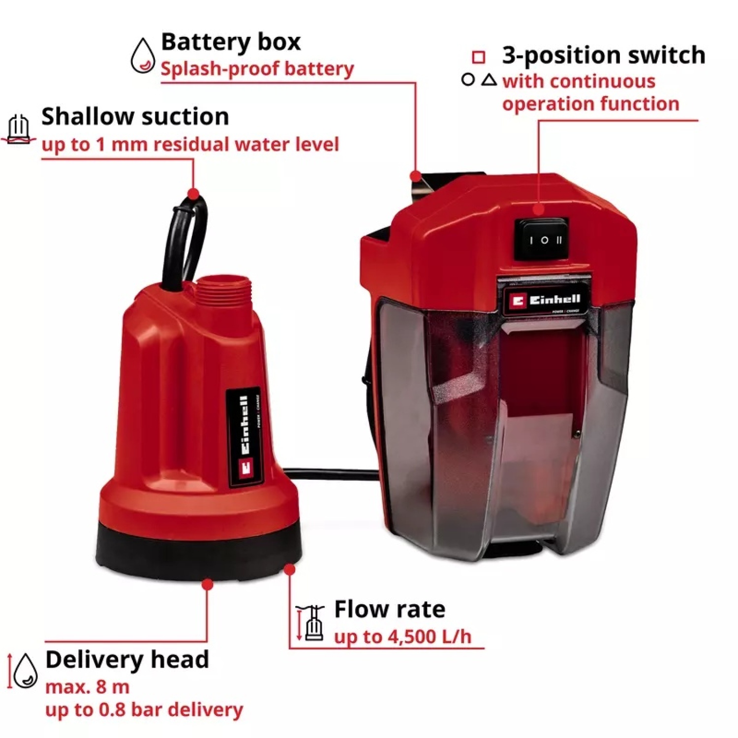Bezvadu skaidrā ūdens sūknis GE-SP 18 LL Li, EINHELL, 4181561, 4500 l/h plūsma, 4.0 Ah akumulators