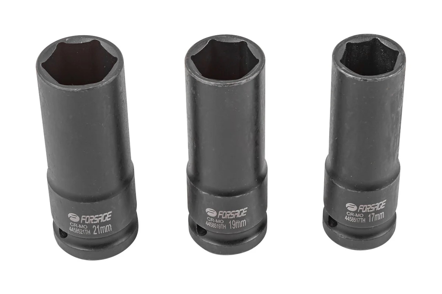 Tai Forsage prekės ženklo F-4032TH smūginių galvučių komplektas, kuriame yra trys galvutės, puikiai tinkamos darbui su veržliarakčiais. Kiekviena galvutė turi 6 kampus ir skirta ratų veržlių užsukimui bei atsukimui. Komplektą sudaro galvutės, kurių dydžiai yra 17 mm, 19 mm ir 21 mm, todėl tai universali priemonė įvairioms automobilių užduotims.