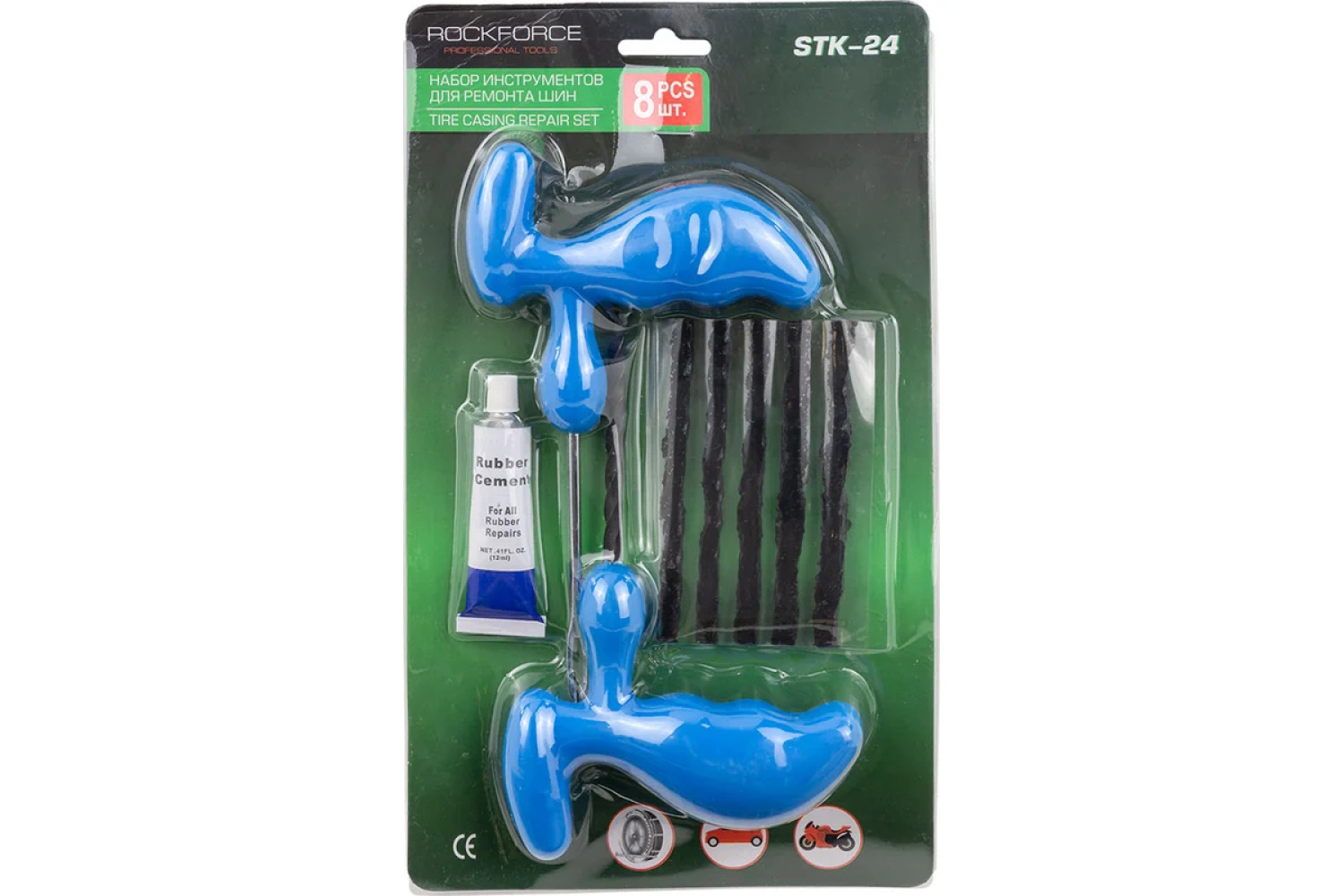 Padangų remonto įrankių rinkinys iš Rockforce, modelis RF-STK-24, susideda iš 8 elementų ir yra lengvai naudojamas, todėl jums net nereikia jokios anksčiau įgytos patirties automobilių remontui. Šis remonto rinkinys apima visus reikalingus elementus greitam ir kokybiškam padangų remontui.