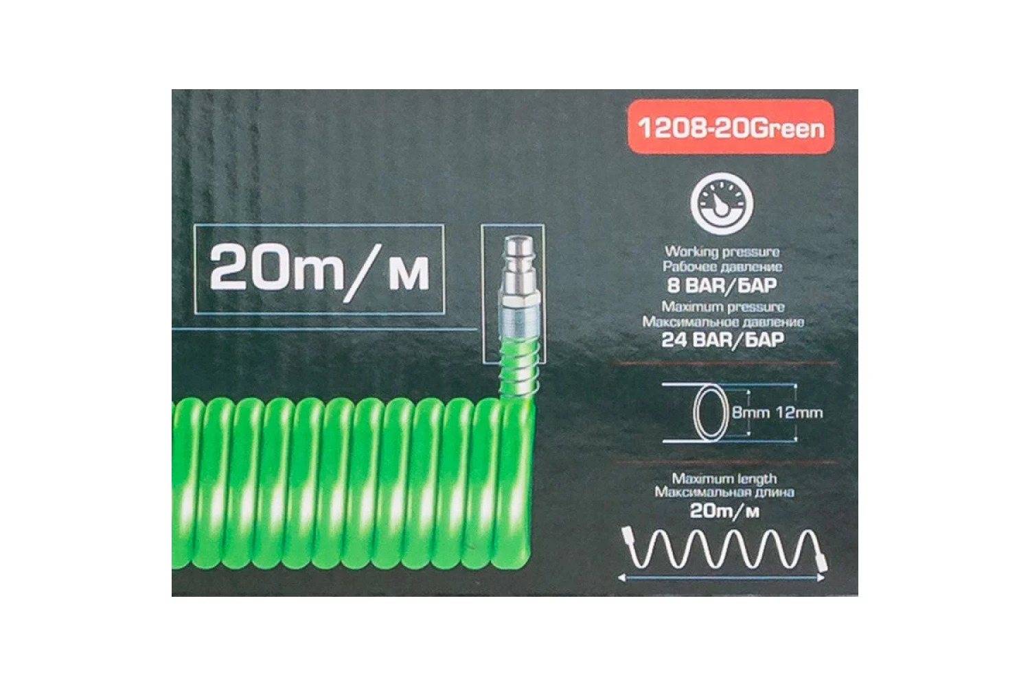 Spiralinė poliuretano žarna Rockforce RF-1208-20Green, 12 mm x 8 mm x 20 m, su greitaisiais jungtimis iš nerūdijančio plieno, yra universalus priedas, puikiai tinkantis daugumai oro kompresorių ir kito pneumatinio įrenginio.